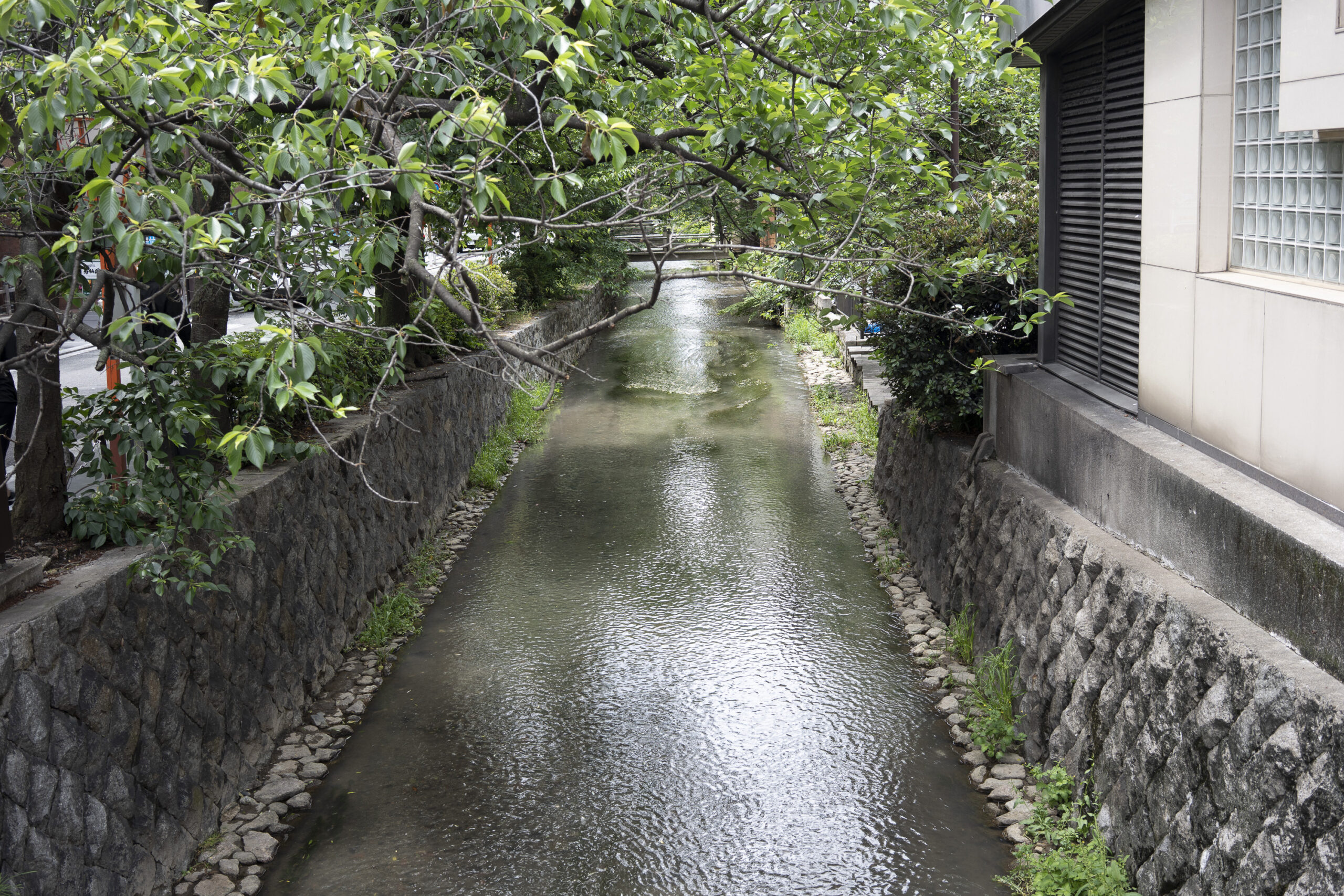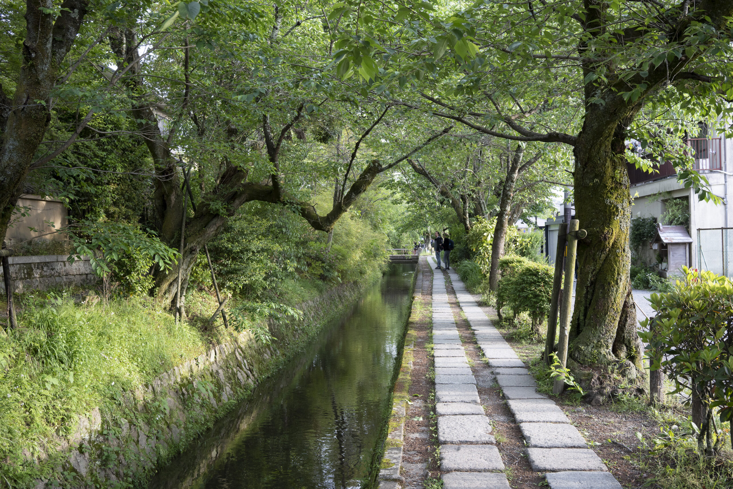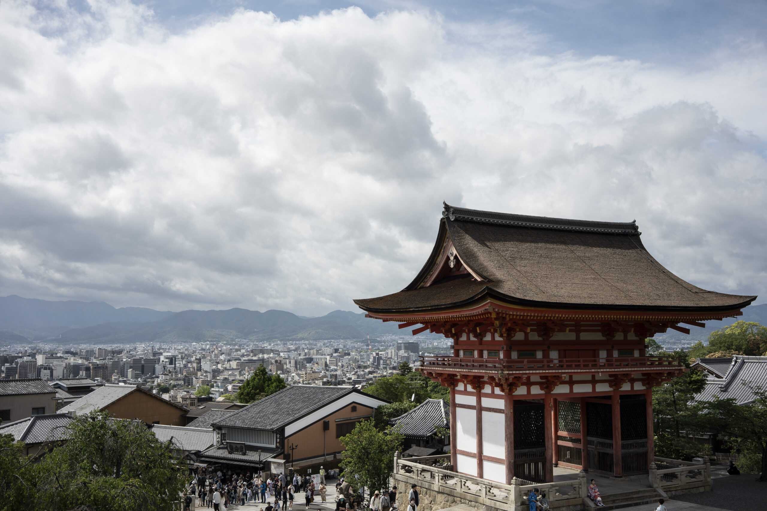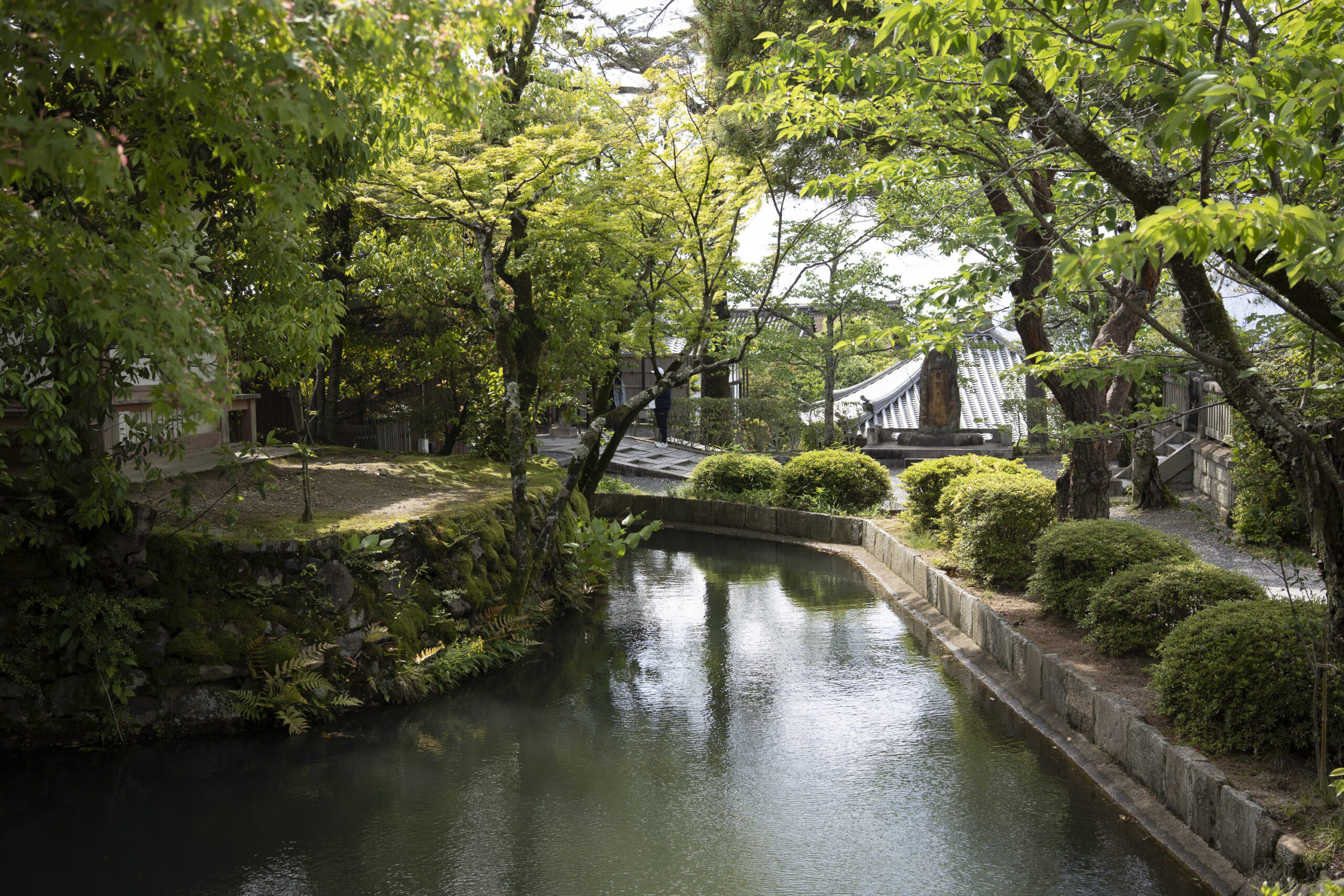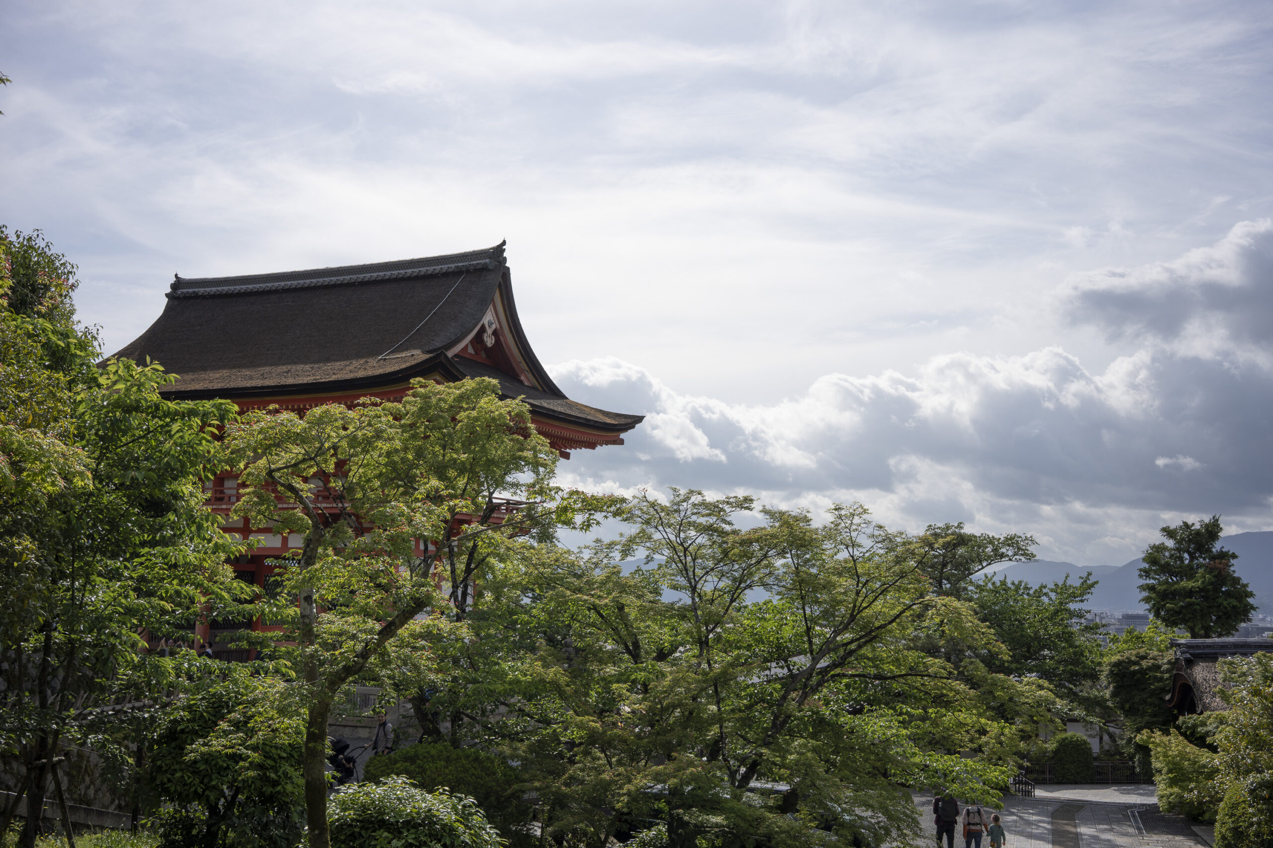 Kyoto’s street plan was originally laid out in 794 when it became Japan’s capital city. The rectangular grid was based on the planning model of the capital of China at the time, Chang-an. Today there are still Kyoto streets that go back to that period. In the area where I stayed there were a lot of narrow lanes – too narrow for automobile traffic, but with wide enough for bike and scooter access to front doors.These narrow lanes can be nicely landscaped and quiet, with carefully designed facades and home entrances – great for walking around and exploring.The modest Kamo River flows south through central Kyoto before joining the larger Katsura River downstream. There are paths on either side of the river – pleasant to walk on, and a spot for interesting activities. This group, maybe a small art class, was sketching the facades across the river at the Shijo bridge.Farther upstream on the banks of the Kamo the figure of a young woman and her swaying skirt stands out against the bright sandy river path.Still farther upstream, the Takano River, on the right, joins the Kamo. Large boulders, with walkable shapes and jump-spacing, have been placed from either shore to the point where the rivers meet. It’s a clever arrangement – a bit like hopping across a small stream on stones, but allowing for higher water flows when the rivers rise. The point appears to be a popular gathering place – on this afternoon there was a steady stream of students meeting up. There was enough distance between the boulders to require a little athleticism and balance to make it across.There are canals in the city as well, originally constructed during the Meiji period to bring water from nearby Lake Biwa to the city for transportation, power, irrigation, and drinking water.The Philosopher’s Path is a two-kilometer path that follows a small branch of the Bila canal system. It runs between two well-known temple complexes. It got its name because a 20th century Japanese philosopher, Nishida Kitarō, apparently used the path for daily meditation.In some places the small canal adjacent to the Philosopher’s Path is deep, its stone walls covered with vines. It’s the end of the day when I finish walking the Philosopher’s Path. The roofs of a nearby temple complex are silhouetted against the sky and distant mountains.This photo was taken on one of my first visits to a temple with gardens. The temple complexes usually have a number of structures with careful landscaping.Here a couple is sitting quietly and taking in a stone, or dry garden. In such gardens trees, plants, and interesting large stones are usually integrated into a sea of small pebbles that are raked into interesting designs.Buildings in such complexes often look out onto carefully shaped landscapes of shrubs, trees, water, and paths. Exterior walls can be large panels that slide open, to eliminate the barrier between the interior and the surrounding gardens.Dragons on cloth stretched across a ceiling at a temple complex. The composition and detail is impressive – and the dragons don’t look all that scary.This is the Niōmon gate entry to one of the best known temples in Kyoto, Kiyomizu-dera – an extensive complex of exquisitely crafted structures sited on the side of Mt. Otowa, on the east side of the city, overlooking the Kyoto Basin. Just inside the Niōmon gate, the Three-story Pagoda rises with beautifully curved and cantilevered roofs. The pagoda and most of the other structures at the temple date from the 15th and 16 centuries. The vibrant orange-red paints are highlighted with bits of yellow at the end of the beams and other structural elements.The main temple building, the Hondo (Main Hall) is the central building in the complex. It was built on a part of the hillside that is almost vertical, with an interesting framework of tall posts that support a wide “stage”, or veranda. If one looks closely one has to be impressed with not only the design, materials, and craftsmanship of the structures, but also with the elegance of this recently added detail, a sleek stainless steel gutter. Notice the gracefully shaped and slender supports for the gutters, and the way they are attached to the structure.It seems as if the roofs are where the majority of the design and execution effort went into these structures. Here two roofs face off against each other – the one on the left a precisely thatched affair with ornate ridge tiles and graceful upward curves at the edges and corners – the other, on the right, with a fully tiled ridge and decorative beam elements that run down the slope of the roof.A closer look at the roof-end tiles on this structure – beautifully done. Notice, also, the elegant addition of detail to the large curving beams, with subtle lines of the recesses that follow the curve. Beam ends and other selected elements have been painted white to stand out – nice.Looking at the Hondo from a different direction one can see the rising slope of Mt. Otowa, with trees in blossom.The extensive grounds of Kiyomizu-dera include little nooks and crannies that have been carefully planned and cared for. I watched gardeners picking up the tiniest leaves from garden beds.Little weathered statues of the Buddhist guardian deity Jizo. From Wikipedia: “they are the protectors of children and travelers. Grieving parents place these statues, often with red bibs, in a shrine to comfort the souls of children who died before their parents, believing Jizo helps them avoid suffering in the afterlife.” A last look at a Kiyomizu-dera roofline before moving on to other sites.The Ginkaku-ji (Silver Pavilion) is a Zen temple with an impressive moss garden and moss-bordered winding paths that climb a hillside – unusual and beautiful.The moss-bordered path continues back down the slope, following a little stream and shaded by Japanese maples.At the Ninna-ji temple, looking out from one of the structures onto the pleasing composition of a grou