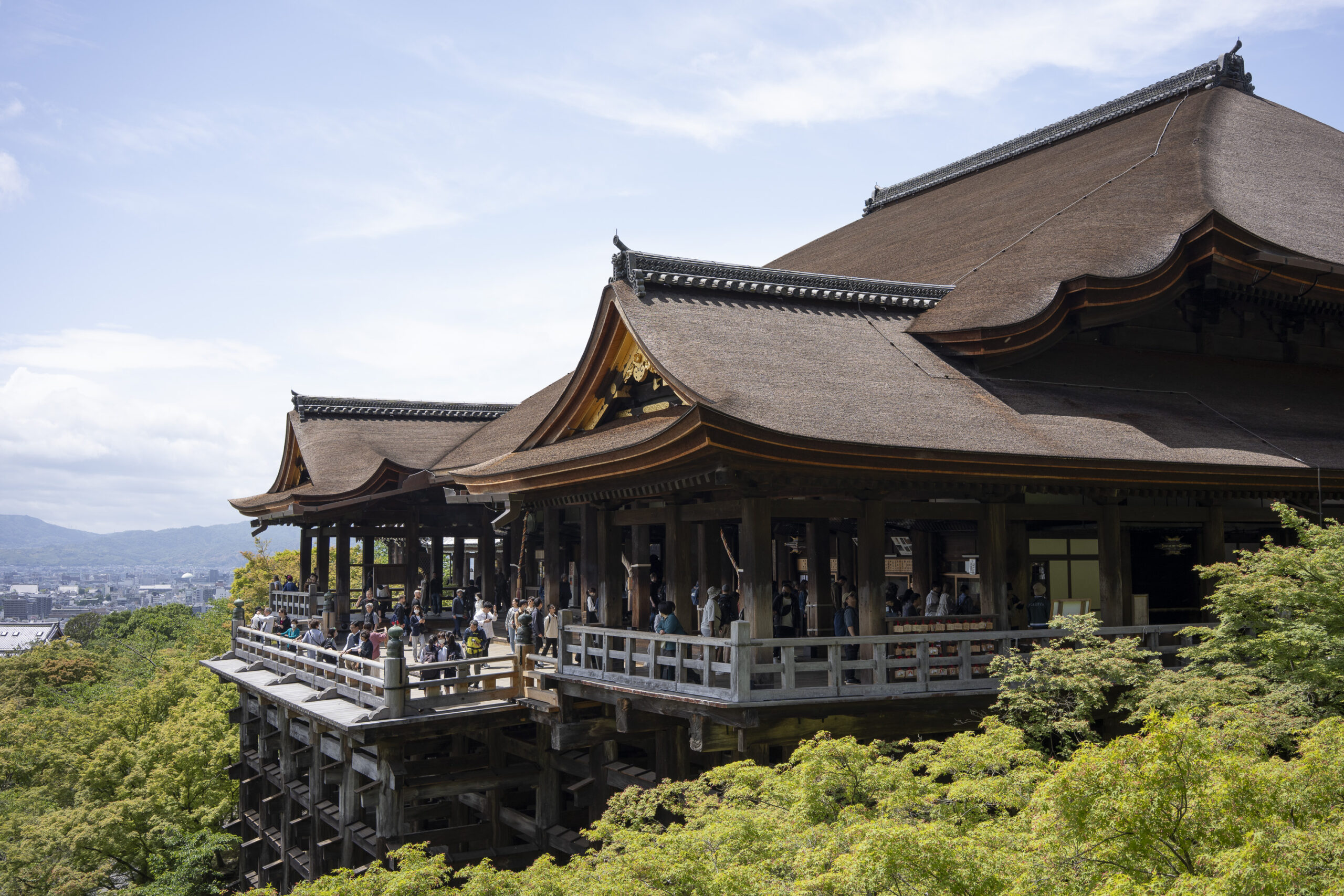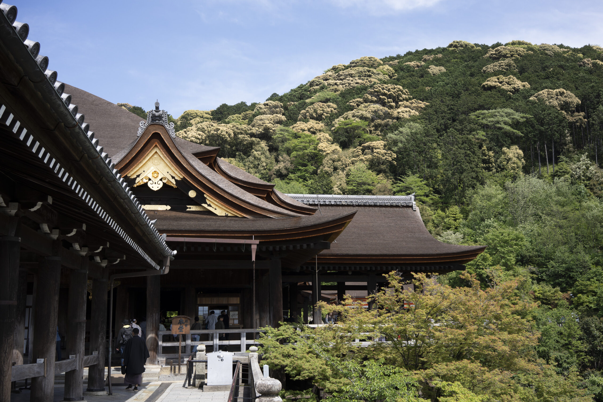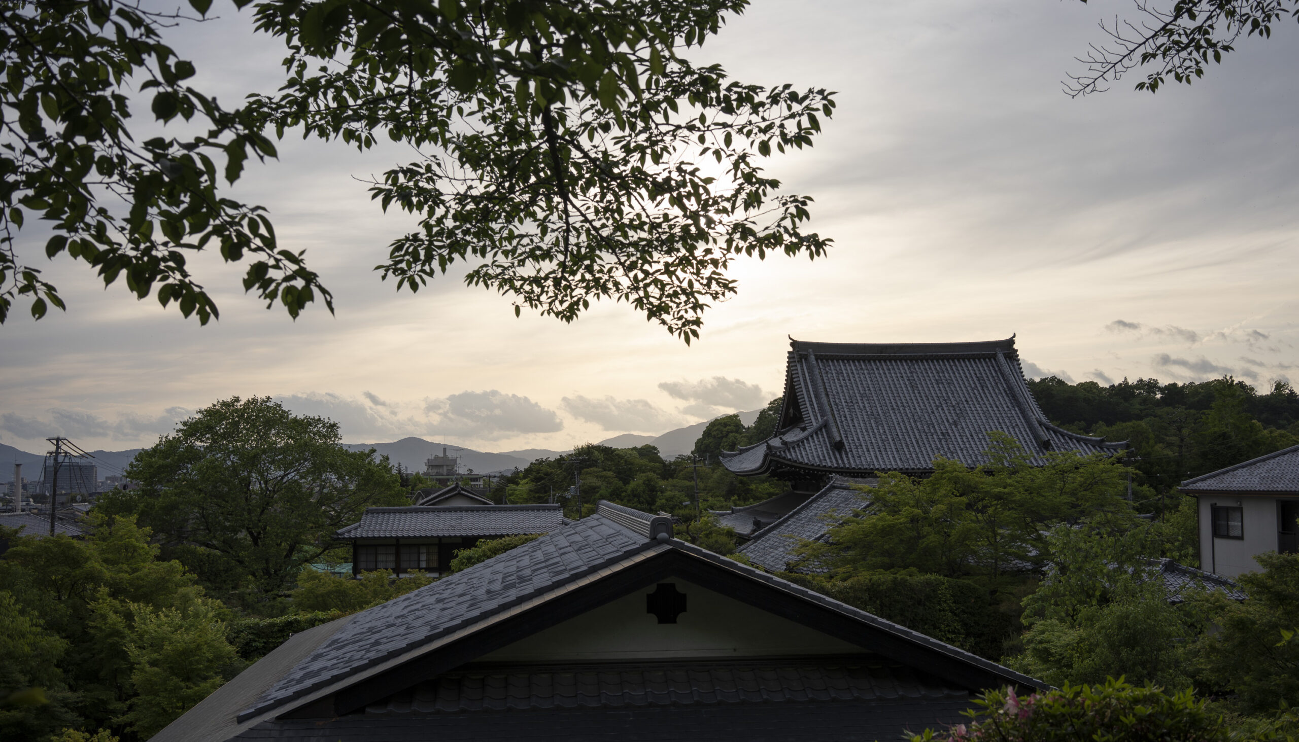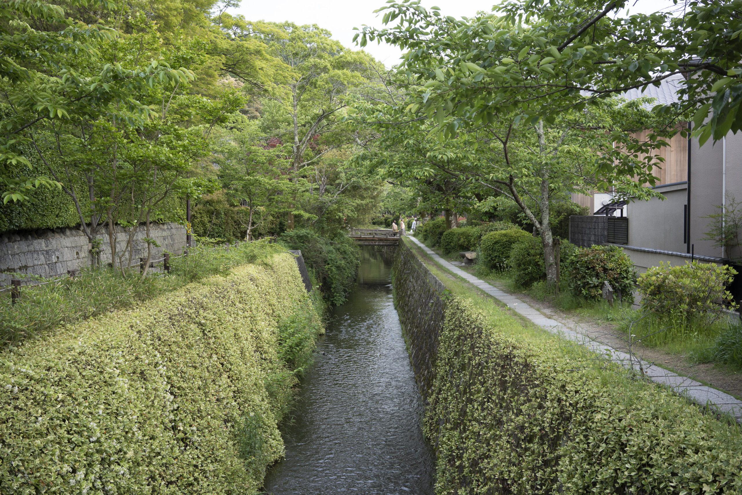 Kyoto’s street plan was originally laid out in 794 when it became Japan’s capital city. The rectangular grid was based on the planning model of the capital of China at the time, Chang-an. Today there are still Kyoto streets that go back to that period. In the area where I stayed there were a lot of narrow lanes – too narrow for automobile traffic, but with wide enough for bike and scooter access to front doors.These narrow lanes can be nicely landscaped and quiet, with carefully designed facades and home entrances – great for walking around and exploring.The modest Kamo River flows south through central Kyoto before joining the larger Katsura River downstream. There are paths on either side of the river – pleasant to walk on, and a spot for interesting activities. This group, maybe a small art class, was sketching the facades across the river at the Shijo bridge.Farther upstream on the banks of the Kamo the figure of a young woman and her swaying skirt stands out against the bright sandy river path.Still farther upstream, the Takano River, on the right, joins the Kamo. Large boulders, with walkable shapes and jump-spacing, have been placed from either shore to the point where the rivers meet. It’s a clever arrangement – a bit like hopping across a small stream on stones, but allowing for higher water flows when the rivers rise. The point appears to be a popular gathering place – on this afternoon there was a steady stream of students meeting up. There was enough distance between the boulders to require a little athleticism and balance to make it across.There are canals in the city as well, originally constructed during the Meiji period to bring water from nearby Lake Biwa to the city for transportation, power, irrigation, and drinking water.The Philosopher’s Path is a two-kilometer path that follows a small branch of the Bila canal system. It runs between two well-known temple complexes. It got its name because a 20th century Japanese philosopher, Nishida Kitarō, apparently used the path for daily meditation.In some places the small canal adjacent to the Philosopher’s Path is deep, its stone walls covered with vines. It’s the end of the day when I finish walking the Philosopher’s Path. The roofs of a nearby temple complex are silhouetted against the sky and distant mountains.This photo was taken on one of my first visits to a temple with gardens. The temple complexes usually have a number of structures with careful landscaping.Here a couple is sitting quietly and taking in a stone, or dry garden. In such gardens trees, plants, and interesting large stones are usually integrated into a sea of small pebbles that are raked into interesting designs.Buildings in such complexes often look out onto carefully shaped landscapes of shrubs, trees, water, and paths. Exterior walls can be large panels that slide open, to eliminate the barrier between the interior and the surrounding gardens.Dragons on cloth stretched across a ceiling at a temple complex. The composition and detail is impressive – and the dragons don’t look all that scary.This is the Niōmon gate entry to one of the best known temples in Kyoto, Kiyomizu-dera – an extensive complex of exquisitely crafted structures sited on the side of Mt. Otowa, on the east side of the city, overlooking the Kyoto Basin. Just inside the Niōmon gate, the Three-story Pagoda rises with beautifully curved and cantilevered roofs. The pagoda and most of the other structures at the temple date from the 15th and 16 centuries. The vibrant orange-red paints are highlighted with bits of yellow at the end of the beams and other structural elements.The main temple building, the Hondo (Main Hall) is the central building in the complex. It was built on a part of the hillside that is almost vertical, with an interesting framework of tall posts that support a wide “stage”, or veranda. If one looks closely one has to be impressed with not only the design, materials, and craftsmanship of the structures, but also with the elegance of this recently added detail, a sleek stainless steel gutter. Notice the gracefully shaped and slender supports for the gutters, and the way they are attached to the structure.It seems as if the roofs are where the majority of the design and execution effort went into these structures. Here two roofs face off against each other – the one on the left a precisely thatched affair with ornate ridge tiles and graceful upward curves at the edges and corners – the other, on the right, with a fully tiled ridge and decorative beam elements that run down the slope of the roof.A closer look at the roof-end tiles on this structure – beautifully done. Notice, also, the elegant addition of detail to the large curving beams, with subtle lines of the recesses that follow the curve. Beam ends and other selected elements have been painted white to stand out – nice.Looking at the Hondo from a different direction one can see the rising slope of Mt. Otowa, with trees in blossom.The extensive grounds of Kiyomizu-dera include little nooks and crannies that have been carefully planned and cared for. I watched gardeners picking up the tiniest leaves from garden beds.Little weathered statues of the Buddhist guardian deity Jizo. From Wikipedia: “they are the protectors of children and travelers. Grieving parents place these statues, often with red bibs, in a shrine to comfort the souls of children who died before their parents, believing Jizo helps them avoid suffering in the afterlife.” A last look at a Kiyomizu-dera roofline before moving on to other sites.The Ginkaku-ji (Silver Pavilion) is a Zen temple with an impressive moss garden and moss-bordered winding paths that climb a hillside – unusual and beautiful.The moss-bordered path continues back down the slope, following a little stream and shaded by Japanese maples.At the Ninna-ji temple, looking out from one of the structures onto the pleasing composition of a grou