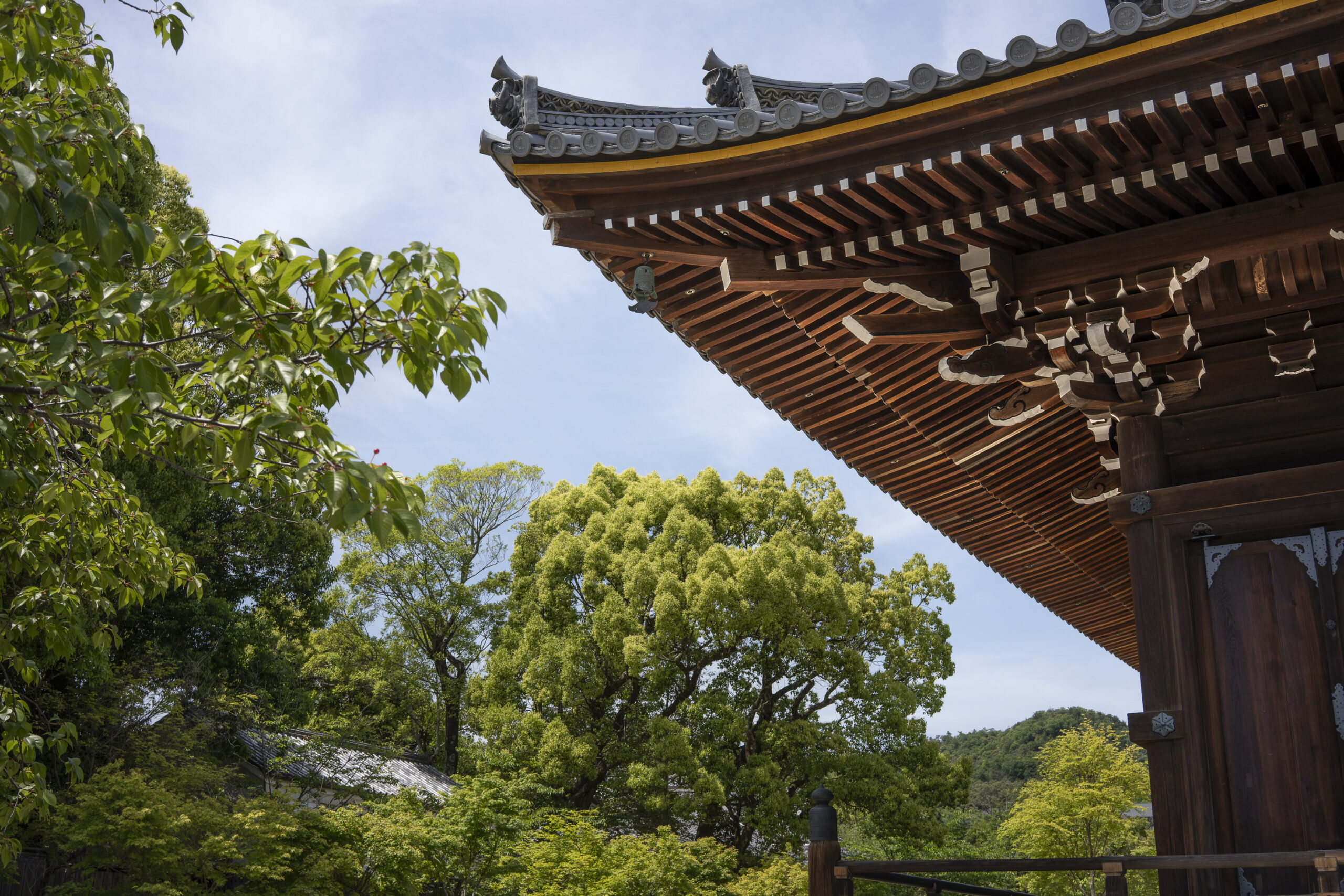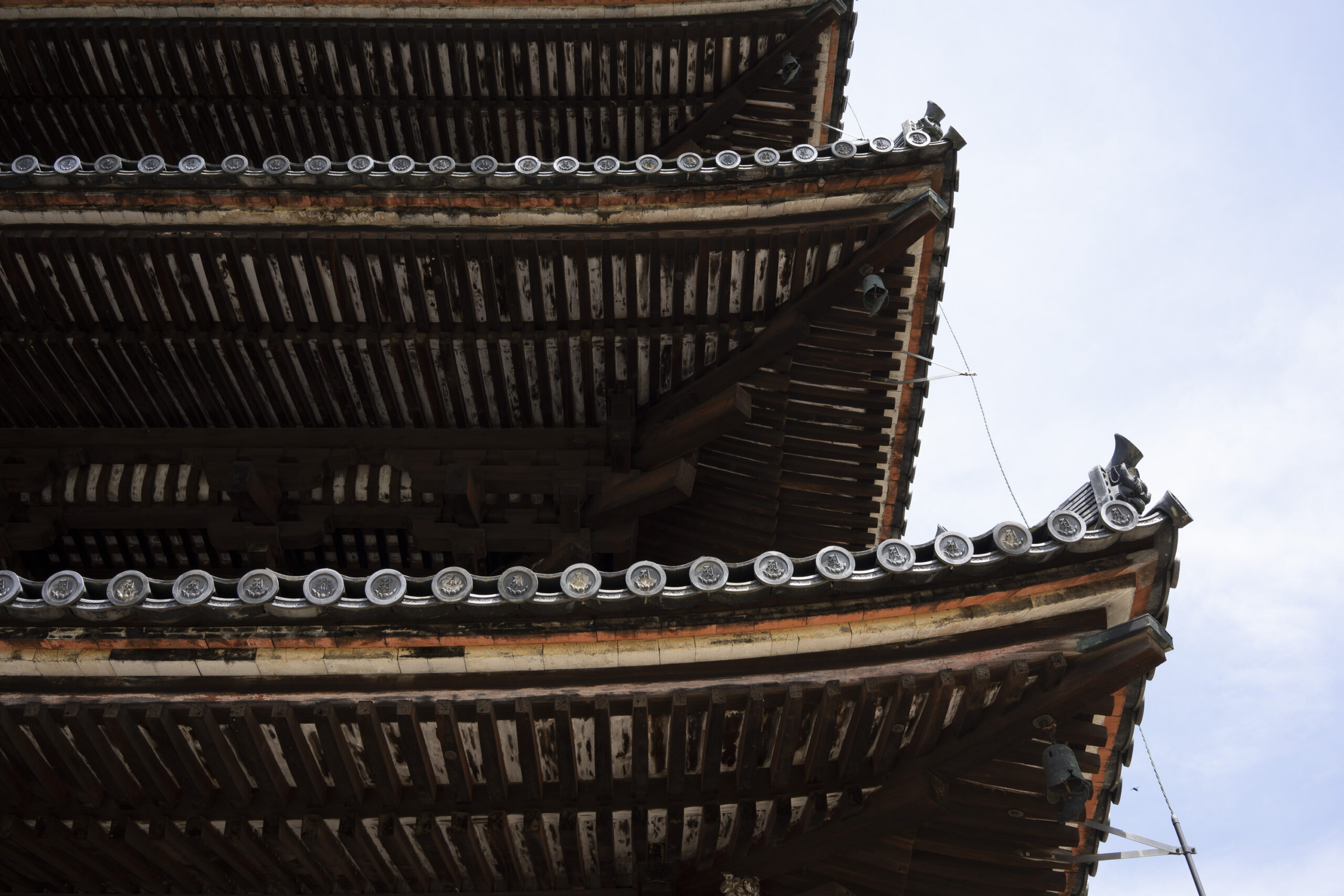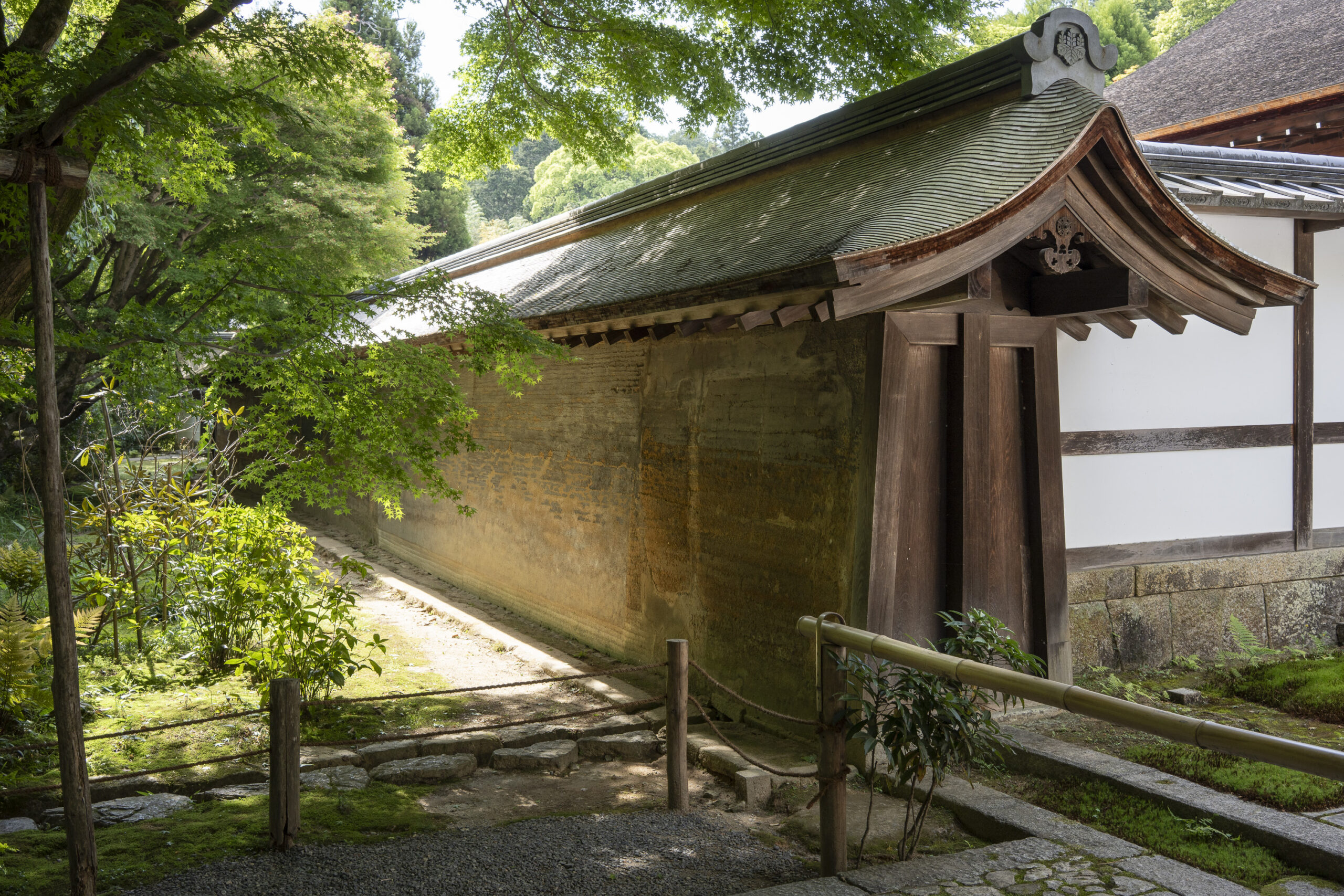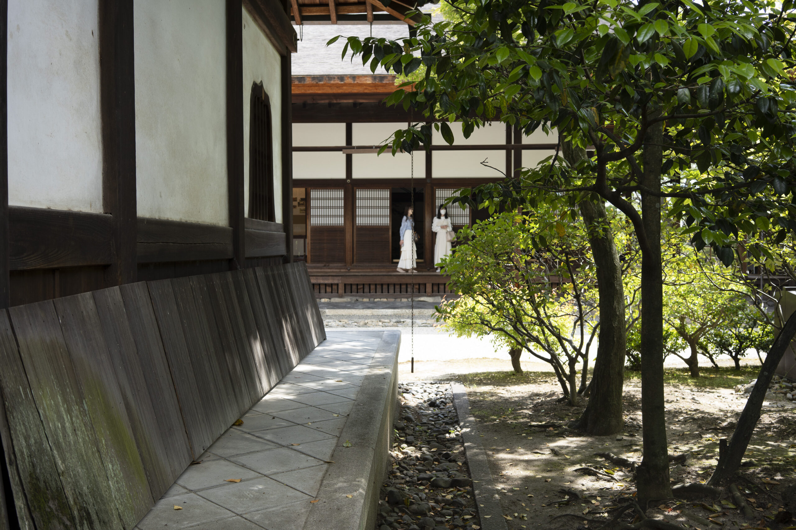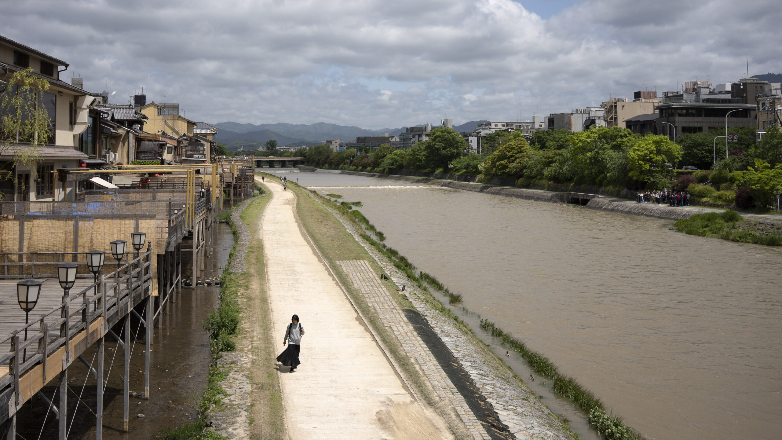 Kyoto’s street plan was originally laid out in 794 when it became Japan’s capital city. The rectangular grid was based on the planning model of the capital of China at the time, Chang-an. Today there are still Kyoto streets that go back to that period. In the area where I stayed there were a lot of narrow lanes – too narrow for automobile traffic, but with wide enough for bike and scooter access to front doors.These narrow lanes can be nicely landscaped and quiet, with carefully designed facades and home entrances – great for walking around and exploring.The modest Kamo River flows south through central Kyoto before joining the larger Katsura River downstream. There are paths on either side of the river – pleasant to walk on, and a spot for interesting activities. This group, maybe a small art class, was sketching the facades across the river at the Shijo bridge.Farther upstream on the banks of the Kamo the figure of a young woman and her swaying skirt stands out against the bright sandy river path.Still farther upstream, the Takano River, on the right, joins the Kamo. Large boulders, with walkable shapes and jump-spacing, have been placed from either shore to the point where the rivers meet. It’s a clever arrangement – a bit like hopping across a small stream on stones, but allowing for higher water flows when the rivers rise. The point appears to be a popular gathering place – on this afternoon there was a steady stream of students meeting up. There was enough distance between the boulders to require a little athleticism and balance to make it across.There are canals in the city as well, originally constructed during the Meiji period to bring water from nearby Lake Biwa to the city for transportation, power, irrigation, and drinking water.The Philosopher’s Path is a two-kilometer path that follows a small branch of the Bila canal system. It runs between two well-known temple complexes. It got its name because a 20th century Japanese philosopher, Nishida Kitarō, apparently used the path for daily meditation.In some places the small canal adjacent to the Philosopher’s Path is deep, its stone walls covered with vines. It’s the end of the day when I finish walking the Philosopher’s Path. The roofs of a nearby temple complex are silhouetted against the sky and distant mountains.This photo was taken on one of my first visits to a temple with gardens. The temple complexes usually have a number of structures with careful landscaping.Here a couple is sitting quietly and taking in a stone, or dry garden. In such gardens trees, plants, and interesting large stones are usually integrated into a sea of small pebbles that are raked into interesting designs.Buildings in such complexes often look out onto carefully shaped landscapes of shrubs, trees, water, and paths. Exterior walls can be large panels that slide open, to eliminate the barrier between the interior and the surrounding gardens.Dragons on cloth stretched across a ceiling at a temple complex. The composition and detail is impressive – and the dragons don’t look all that scary.This is the Niōmon gate entry to one of the best known temples in Kyoto, Kiyomizu-dera – an extensive complex of exquisitely crafted structures sited on the side of Mt. Otowa, on the east side of the city, overlooking the Kyoto Basin. Just inside the Niōmon gate, the Three-story Pagoda rises with beautifully curved and cantilevered roofs. The pagoda and most of the other structures at the temple date from the 15th and 16 centuries. The vibrant orange-red paints are highlighted with bits of yellow at the end of the beams and other structural elements.The main temple building, the Hondo (Main Hall) is the central building in the complex. It was built on a part of the hillside that is almost vertical, with an interesting framework of tall posts that support a wide “stage”, or veranda. If one looks closely one has to be impressed with not only the design, materials, and craftsmanship of the structures, but also with the elegance of this recently added detail, a sleek stainless steel gutter. Notice the gracefully shaped and slender supports for the gutters, and the way they are attached to the structure.It seems as if the roofs are where the majority of the design and execution effort went into these structures. Here two roofs face off against each other – the one on the left a precisely thatched affair with ornate ridge tiles and graceful upward curves at the edges and corners – the other, on the right, with a fully tiled ridge and decorative beam elements that run down the slope of the roof.A closer look at the roof-end tiles on this structure – beautifully done. Notice, also, the elegant addition of detail to the large curving beams, with subtle lines of the recesses that follow the curve. Beam ends and other selected elements have been painted white to stand out – nice.Looking at the Hondo from a different direction one can see the rising slope of Mt. Otowa, with trees in blossom.The extensive grounds of Kiyomizu-dera include little nooks and crannies that have been carefully planned and cared for. I watched gardeners picking up the tiniest leaves from garden beds.Little weathered statues of the Buddhist guardian deity Jizo. From Wikipedia: “they are the protectors of children and travelers. Grieving parents place these statues, often with red bibs, in a shrine to comfort the souls of children who died before their parents, believing Jizo helps them avoid suffering in the afterlife.” A last look at a Kiyomizu-dera roofline before moving on to other sites.The Ginkaku-ji (Silver Pavilion) is a Zen temple with an impressive moss garden and moss-bordered winding paths that climb a hillside – unusual and beautiful.The moss-bordered path continues back down the slope, following a little stream and shaded by Japanese maples.At the Ninna-ji temple, looking out from one of the structures onto the pleasing composition of a grou