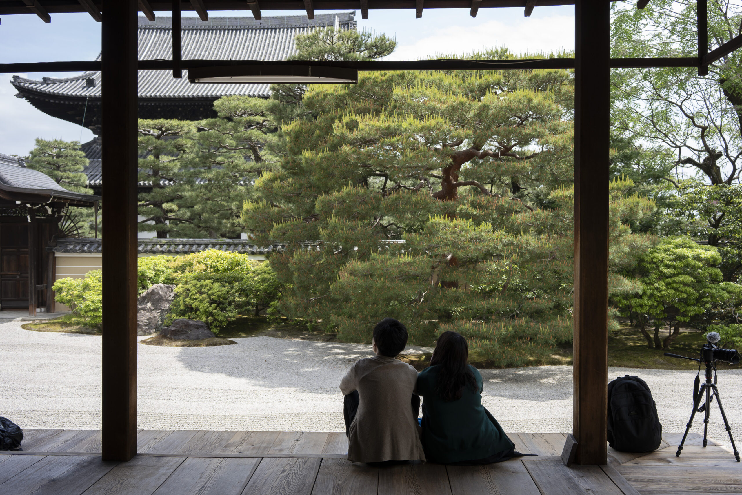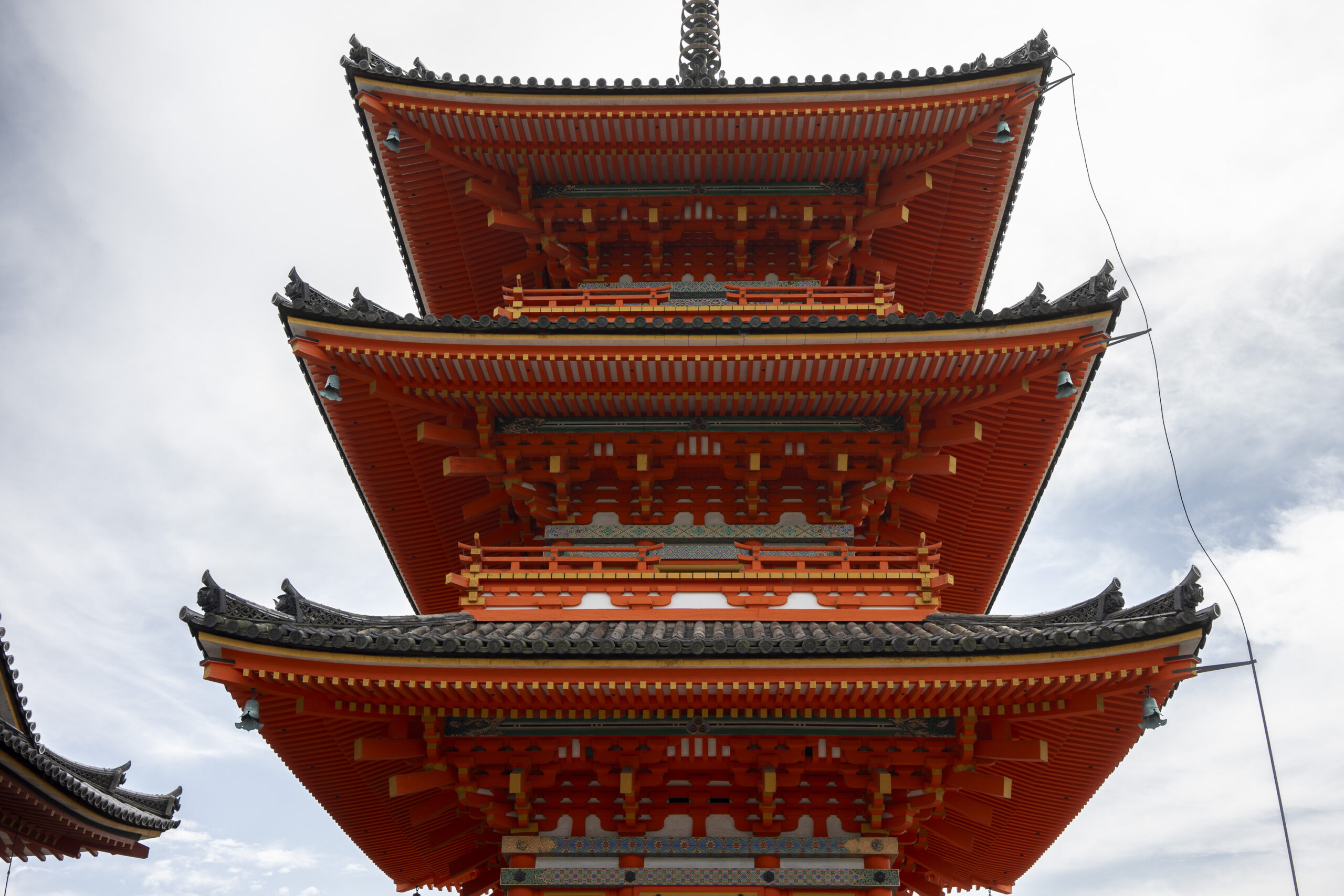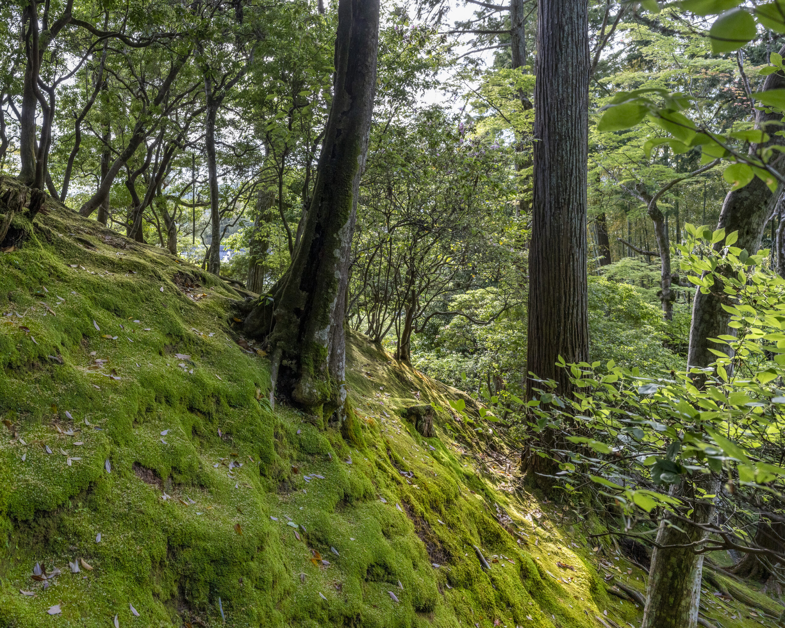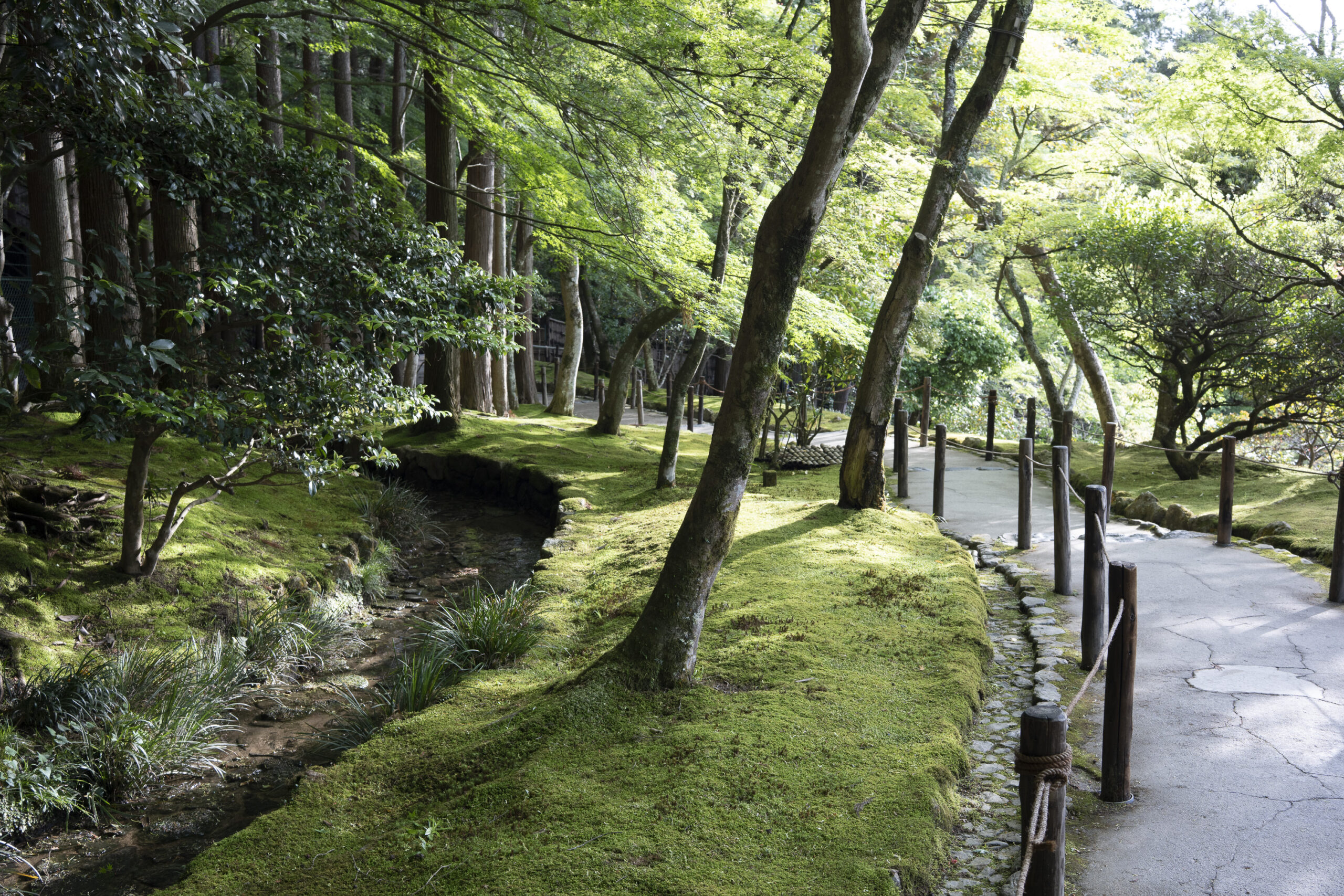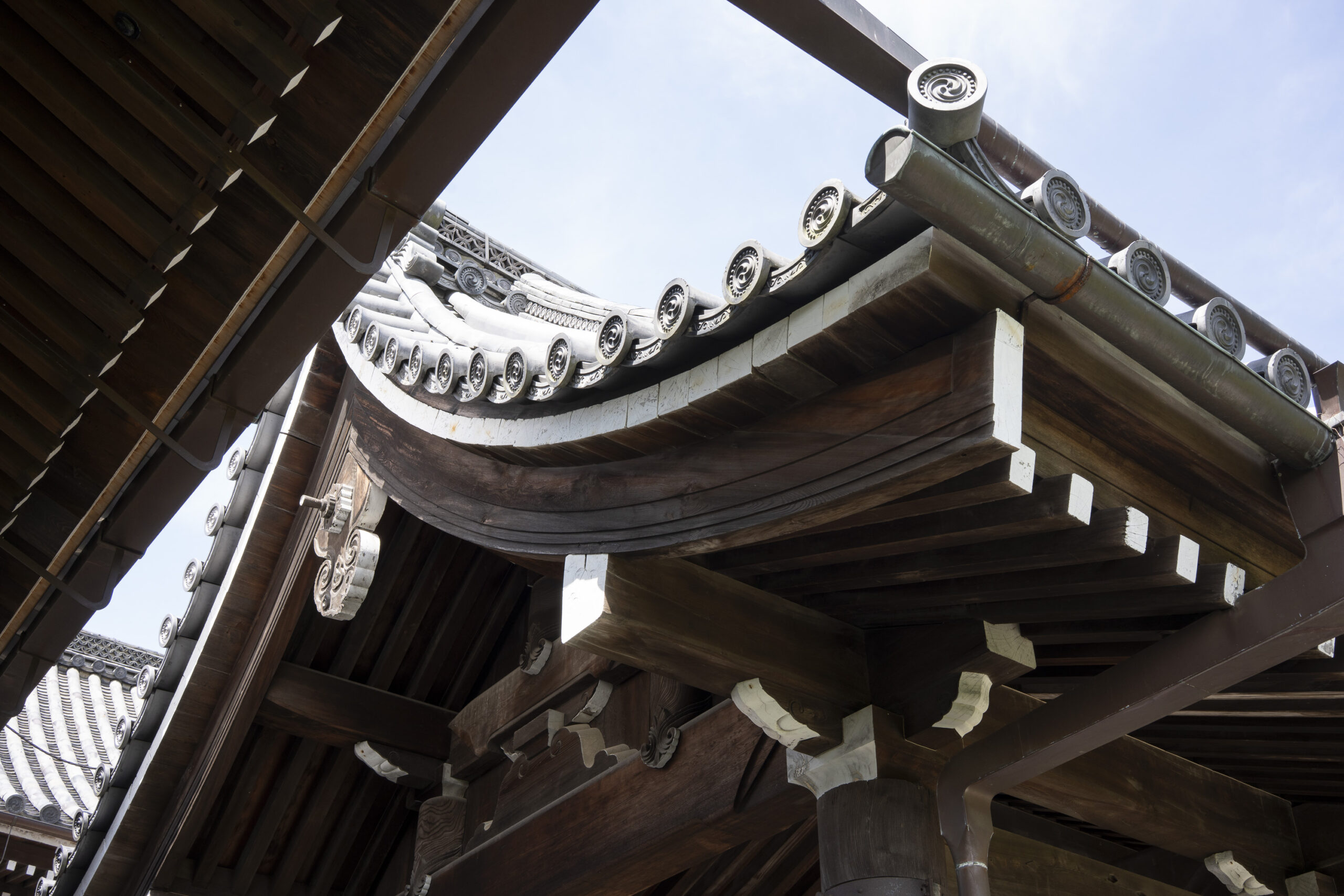 Kyoto’s street plan was originally laid out in 794 when it became Japan’s capital city. The rectangular grid was based on the planning model of the capital of China at the time, Chang-an. Today there are still Kyoto streets that go back to that period. In the area where I stayed there were a lot of narrow lanes – too narrow for automobile traffic, but with wide enough for bike and scooter access to front doors.These narrow lanes can be nicely landscaped and quiet, with carefully designed facades and home entrances – great for walking around and exploring.The modest Kamo River flows south through central Kyoto before joining the larger Katsura River downstream. There are paths on either side of the river – pleasant to walk on, and a spot for interesting activities. This group, maybe a small art class, was sketching the facades across the river at the Shijo bridge.Farther upstream on the banks of the Kamo the figure of a young woman and her swaying skirt stands out against the bright sandy river path.Still farther upstream, the Takano River, on the right, joins the Kamo. Large boulders, with walkable shapes and jump-spacing, have been placed from either shore to the point where the rivers meet. It’s a clever arrangement – a bit like hopping across a small stream on stones, but allowing for higher water flows when the rivers rise. The point appears to be a popular gathering place – on this afternoon there was a steady stream of students meeting up. There was enough distance between the boulders to require a little athleticism and balance to make it across.There are canals in the city as well, originally constructed during the Meiji period to bring water from nearby Lake Biwa to the city for transportation, power, irrigation, and drinking water.The Philosopher’s Path is a two-kilometer path that follows a small branch of the Bila canal system. It runs between two well-known temple complexes. It got its name because a 20th century Japanese philosopher, Nishida Kitarō, apparently used the path for daily meditation.In some places the small canal adjacent to the Philosopher’s Path is deep, its stone walls covered with vines. It’s the end of the day when I finish walking the Philosopher’s Path. The roofs of a nearby temple complex are silhouetted against the sky and distant mountains.This photo was taken on one of my first visits to a temple with gardens. The temple complexes usually have a number of structures with careful landscaping.Here a couple is sitting quietly and taking in a stone, or dry garden. In such gardens trees, plants, and interesting large stones are usually integrated into a sea of small pebbles that are raked into interesting designs.Buildings in such complexes often look out onto carefully shaped landscapes of shrubs, trees, water, and paths. Exterior walls can be large panels that slide open, to eliminate the barrier between the interior and the surrounding gardens.Dragons on cloth stretched across a ceiling at a temple complex. The composition and detail is impressive – and the dragons don’t look all that scary.This is the Niōmon gate entry to one of the best known temples in Kyoto, Kiyomizu-dera – an extensive complex of exquisitely crafted structures sited on the side of Mt. Otowa, on the east side of the city, overlooking the Kyoto Basin. Just inside the Niōmon gate, the Three-story Pagoda rises with beautifully curved and cantilevered roofs. The pagoda and most of the other structures at the temple date from the 15th and 16 centuries. The vibrant orange-red paints are highlighted with bits of yellow at the end of the beams and other structural elements.The main temple building, the Hondo (Main Hall) is the central building in the complex. It was built on a part of the hillside that is almost vertical, with an interesting framework of tall posts that support a wide “stage”, or veranda. If one looks closely one has to be impressed with not only the design, materials, and craftsmanship of the structures, but also with the elegance of this recently added detail, a sleek stainless steel gutter. Notice the gracefully shaped and slender supports for the gutters, and the way they are attached to the structure.It seems as if the roofs are where the majority of the design and execution effort went into these structures. Here two roofs face off against each other – the one on the left a precisely thatched affair with ornate ridge tiles and graceful upward curves at the edges and corners – the other, on the right, with a fully tiled ridge and decorative beam elements that run down the slope of the roof.A closer look at the roof-end tiles on this structure – beautifully done. Notice, also, the elegant addition of detail to the large curving beams, with subtle lines of the recesses that follow the curve. Beam ends and other selected elements have been painted white to stand out – nice.Looking at the Hondo from a different direction one can see the rising slope of Mt. Otowa, with trees in blossom.The extensive grounds of Kiyomizu-dera include little nooks and crannies that have been carefully planned and cared for. I watched gardeners picking up the tiniest leaves from garden beds.Little weathered statues of the Buddhist guardian deity Jizo. From Wikipedia: “they are the protectors of children and travelers. Grieving parents place these statues, often with red bibs, in a shrine to comfort the souls of children who died before their parents, believing Jizo helps them avoid suffering in the afterlife.” A last look at a Kiyomizu-dera roofline before moving on to other sites.The Ginkaku-ji (Silver Pavilion) is a Zen temple with an impressive moss garden and moss-bordered winding paths that climb a hillside – unusual and beautiful.The moss-bordered path continues back down the slope, following a little stream and shaded by Japanese maples.At the Ninna-ji temple, looking out from one of the structures onto the pleasing composition of a grou