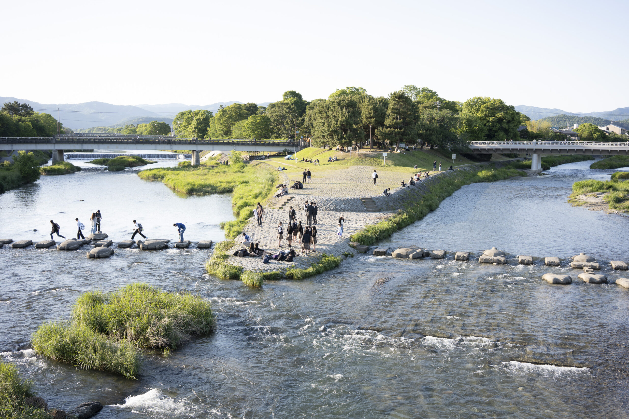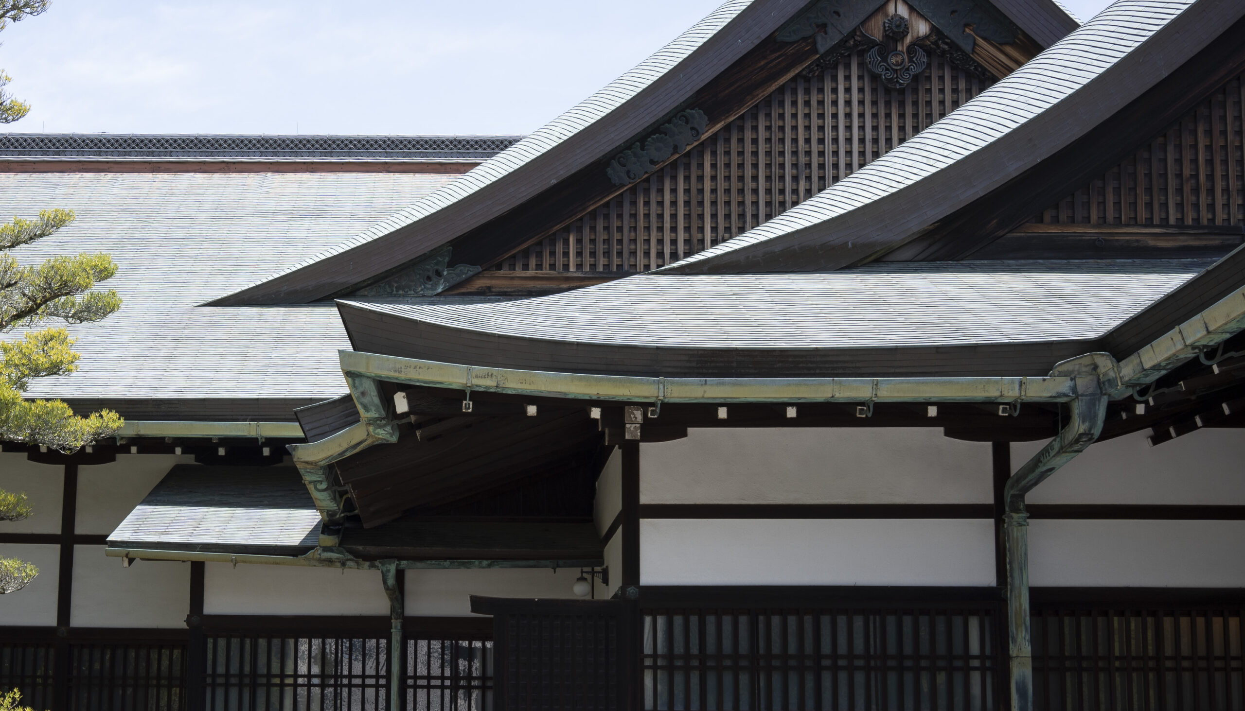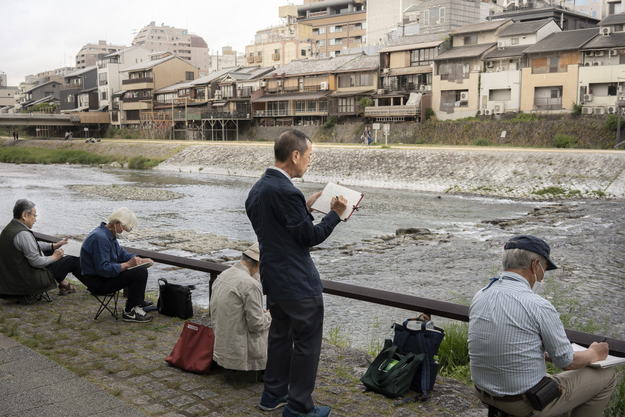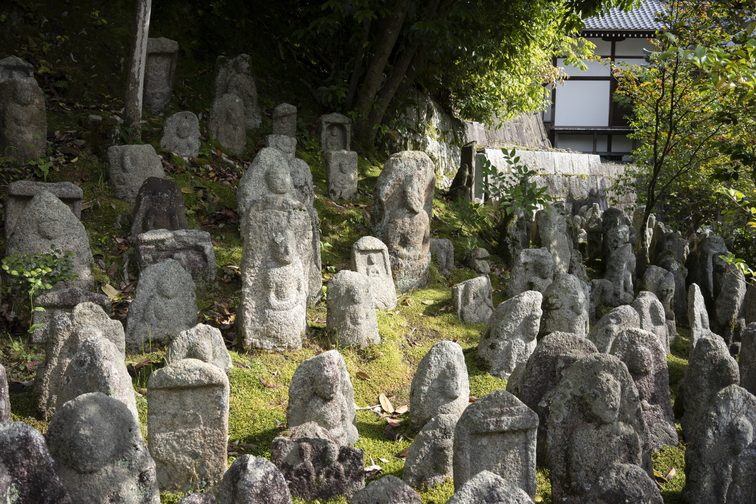 Kyoto’s street plan was originally laid out in 794 when it became Japan’s capital city. The rectangular grid was based on the planning model of the capital of China at the time, Chang-an. Today there are still Kyoto streets that go back to that period. In the area where I stayed there were a lot of narrow lanes – too narrow for automobile traffic, but with wide enough for bike and scooter access to front doors.These narrow lanes can be nicely landscaped and quiet, with carefully designed facades and home entrances – great for walking around and exploring.The modest Kamo River flows south through central Kyoto before joining the larger Katsura River downstream. There are paths on either side of the river – pleasant to walk on, and a spot for interesting activities. This group, maybe a small art class, was sketching the facades across the river at the Shijo bridge.Farther upstream on the banks of the Kamo the figure of a young woman and her swaying skirt stands out against the bright sandy river path.Still farther upstream, the Takano River, on the right, joins the Kamo. Large boulders, with walkable shapes and jump-spacing, have been placed from either shore to the point where the rivers meet. It’s a clever arrangement – a bit like hopping across a small stream on stones, but allowing for higher water flows when the rivers rise. The point appears to be a popular gathering place – on this afternoon there was a steady stream of students meeting up. There was enough distance between the boulders to require a little athleticism and balance to make it across.There are canals in the city as well, originally constructed during the Meiji period to bring water from nearby Lake Biwa to the city for transportation, power, irrigation, and drinking water.The Philosopher’s Path is a two-kilometer path that follows a small branch of the Bila canal system. It runs between two well-known temple complexes. It got its name because a 20th century Japanese philosopher, Nishida Kitarō, apparently used the path for daily meditation.In some places the small canal adjacent to the Philosopher’s Path is deep, its stone walls covered with vines. It’s the end of the day when I finish walking the Philosopher’s Path. The roofs of a nearby temple complex are silhouetted against the sky and distant mountains.This photo was taken on one of my first visits to a temple with gardens. The temple complexes usually have a number of structures with careful landscaping.Here a couple is sitting quietly and taking in a stone, or dry garden. In such gardens trees, plants, and interesting large stones are usually integrated into a sea of small pebbles that are raked into interesting designs.Buildings in such complexes often look out onto carefully shaped landscapes of shrubs, trees, water, and paths. Exterior walls can be large panels that slide open, to eliminate the barrier between the interior and the surrounding gardens.Dragons on cloth stretched across a ceiling at a temple complex. The composition and detail is impressive – and the dragons don’t look all that scary.This is the Niōmon gate entry to one of the best known temples in Kyoto, Kiyomizu-dera – an extensive complex of exquisitely crafted structures sited on the side of Mt. Otowa, on the east side of the city, overlooking the Kyoto Basin. Just inside the Niōmon gate, the Three-story Pagoda rises with beautifully curved and cantilevered roofs. The pagoda and most of the other structures at the temple date from the 15th and 16 centuries. The vibrant orange-red paints are highlighted with bits of yellow at the end of the beams and other structural elements.The main temple building, the Hondo (Main Hall) is the central building in the complex. It was built on a part of the hillside that is almost vertical, with an interesting framework of tall posts that support a wide “stage”, or veranda. If one looks closely one has to be impressed with not only the design, materials, and craftsmanship of the structures, but also with the elegance of this recently added detail, a sleek stainless steel gutter. Notice the gracefully shaped and slender supports for the gutters, and the way they are attached to the structure.It seems as if the roofs are where the majority of the design and execution effort went into these structures. Here two roofs face off against each other – the one on the left a precisely thatched affair with ornate ridge tiles and graceful upward curves at the edges and corners – the other, on the right, with a fully tiled ridge and decorative beam elements that run down the slope of the roof.A closer look at the roof-end tiles on this structure – beautifully done. Notice, also, the elegant addition of detail to the large curving beams, with subtle lines of the recesses that follow the curve. Beam ends and other selected elements have been painted white to stand out – nice.Looking at the Hondo from a different direction one can see the rising slope of Mt. Otowa, with trees in blossom.The extensive grounds of Kiyomizu-dera include little nooks and crannies that have been carefully planned and cared for. I watched gardeners picking up the tiniest leaves from garden beds.Little weathered statues of the Buddhist guardian deity Jizo. From Wikipedia: “they are the protectors of children and travelers. Grieving parents place these statues, often with red bibs, in a shrine to comfort the souls of children who died before their parents, believing Jizo helps them avoid suffering in the afterlife.” A last look at a Kiyomizu-dera roofline before moving on to other sites.The Ginkaku-ji (Silver Pavilion) is a Zen temple with an impressive moss garden and moss-bordered winding paths that climb a hillside – unusual and beautiful.The moss-bordered path continues back down the slope, following a little stream and shaded by Japanese maples.At the Ninna-ji temple, looking out from one of the structures onto the pleasing composition of a grou