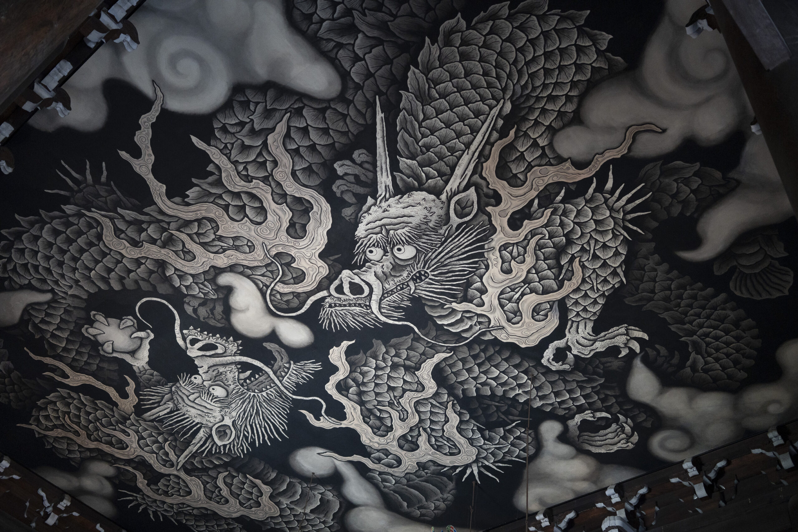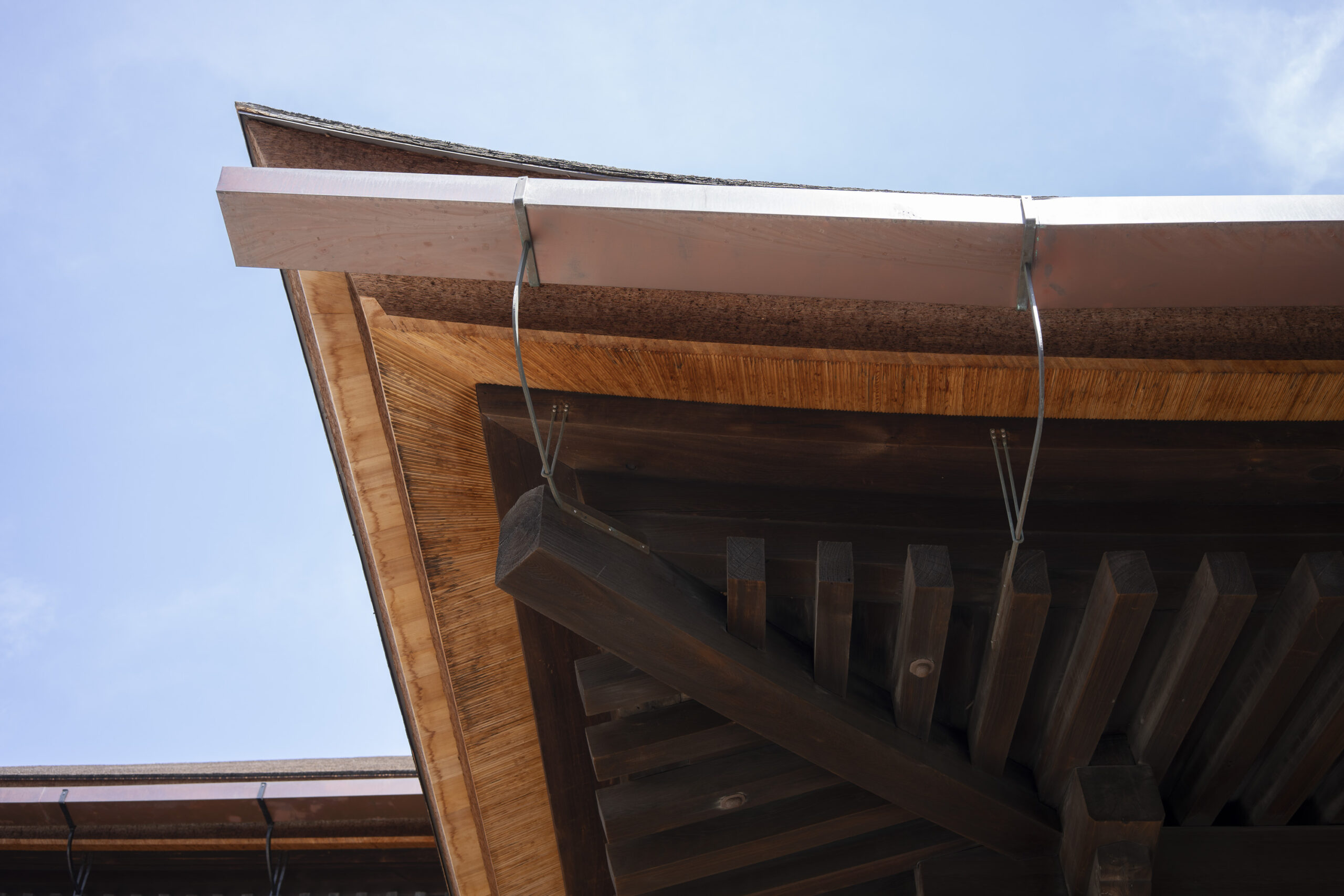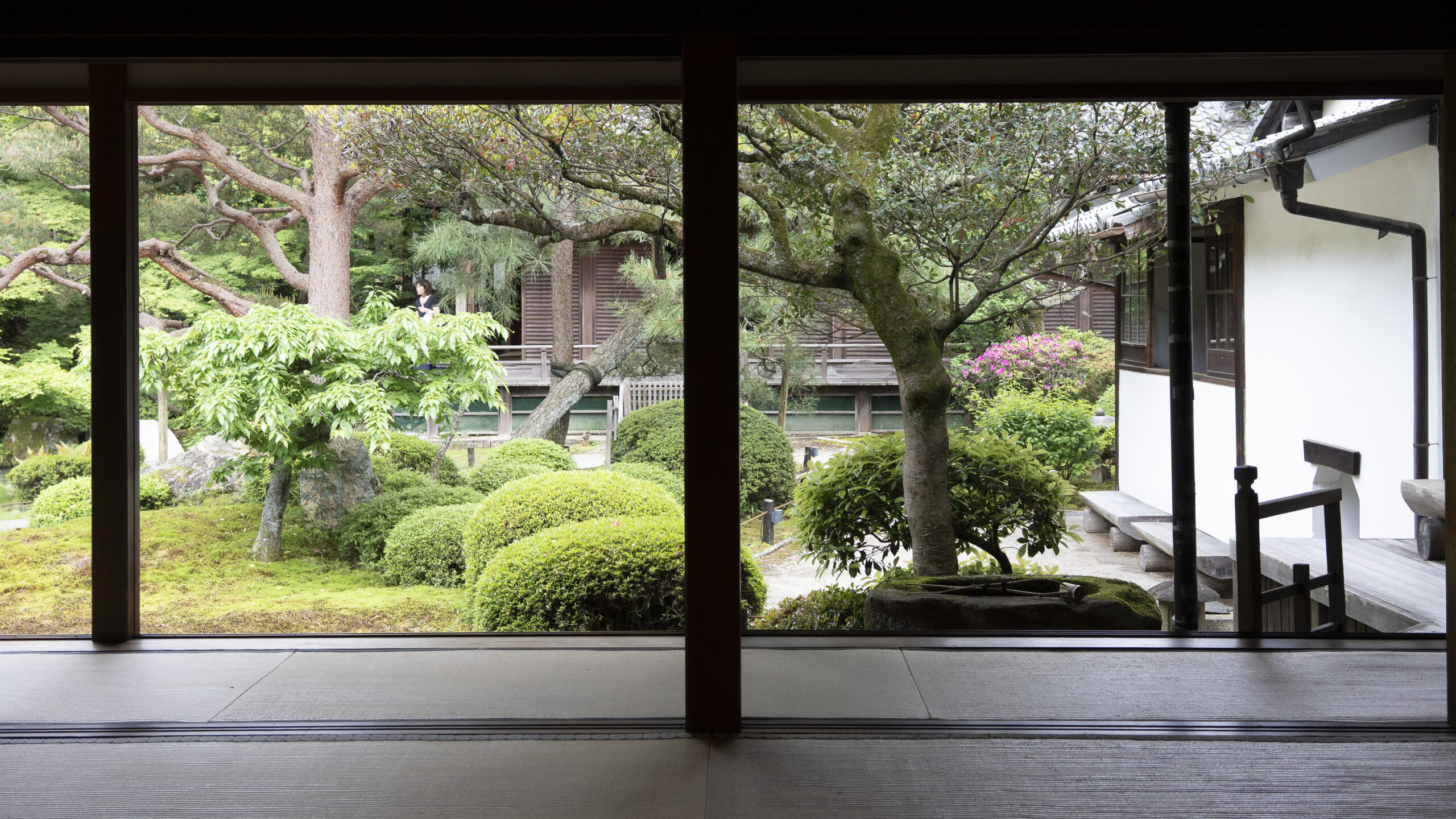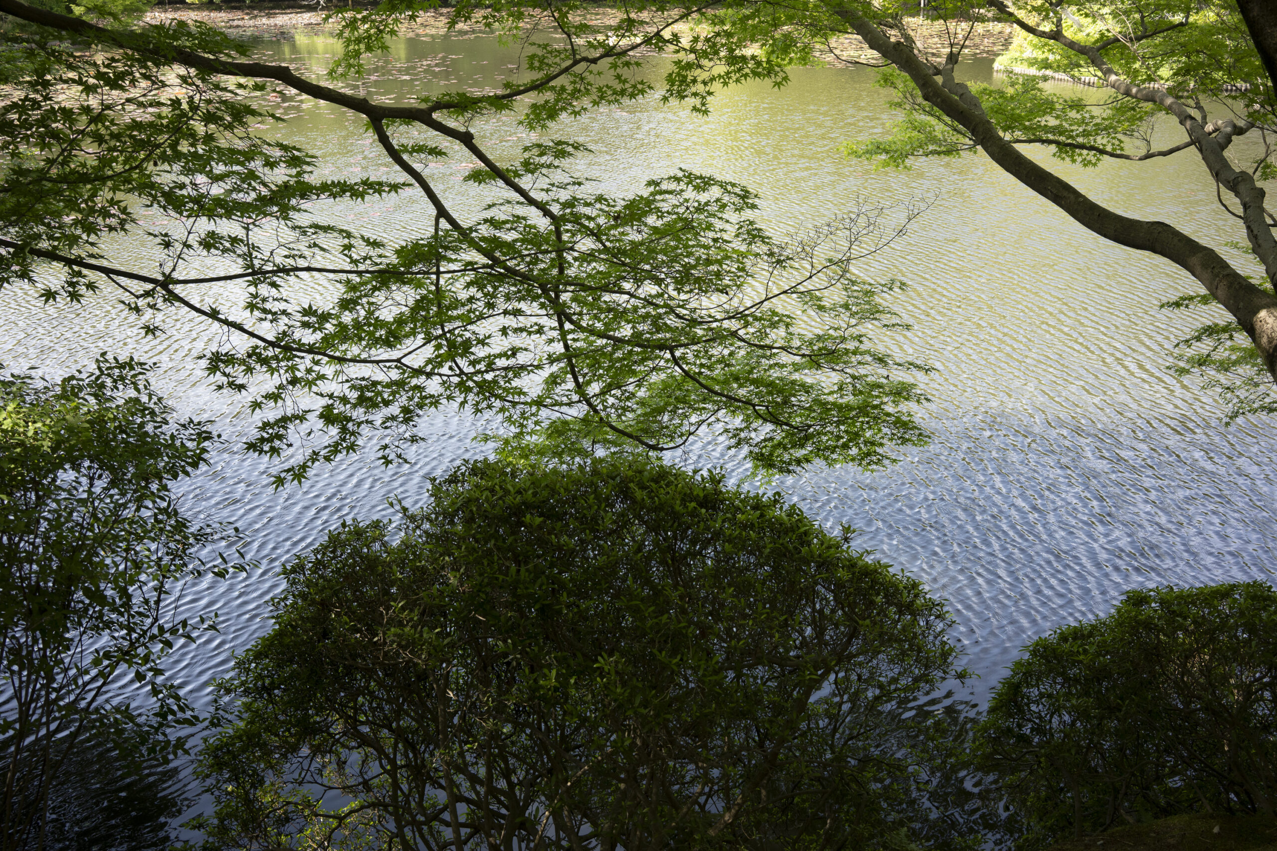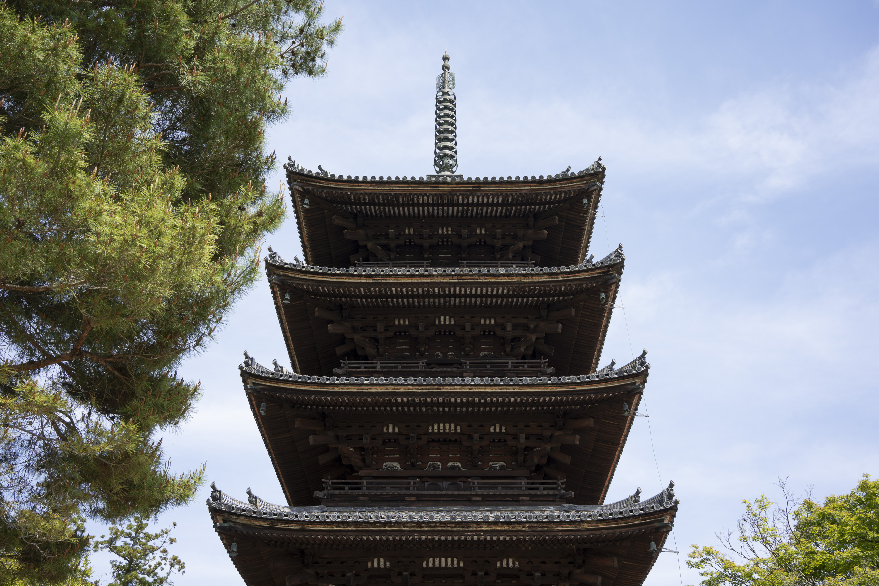 Kyoto’s street plan was originally laid out in 794 when it became Japan’s capital city. The rectangular grid was based on the planning model of the capital of China at the time, Chang-an. Today there are still Kyoto streets that go back to that period. In the area where I stayed there were a lot of narrow lanes – too narrow for automobile traffic, but with wide enough for bike and scooter access to front doors.These narrow lanes can be nicely landscaped and quiet, with carefully designed facades and home entrances – great for walking around and exploring.The modest Kamo River flows south through central Kyoto before joining the larger Katsura River downstream. There are paths on either side of the river – pleasant to walk on, and a spot for interesting activities. This group, maybe a small art class, was sketching the facades across the river at the Shijo bridge.Farther upstream on the banks of the Kamo the figure of a young woman and her swaying skirt stands out against the bright sandy river path.Still farther upstream, the Takano River, on the right, joins the Kamo. Large boulders, with walkable shapes and jump-spacing, have been placed from either shore to the point where the rivers meet. It’s a clever arrangement – a bit like hopping across a small stream on stones, but allowing for higher water flows when the rivers rise. The point appears to be a popular gathering place – on this afternoon there was a steady stream of students meeting up. There was enough distance between the boulders to require a little athleticism and balance to make it across.There are canals in the city as well, originally constructed during the Meiji period to bring water from nearby Lake Biwa to the city for transportation, power, irrigation, and drinking water.The Philosopher’s Path is a two-kilometer path that follows a small branch of the Bila canal system. It runs between two well-known temple complexes. It got its name because a 20th century Japanese philosopher, Nishida Kitarō, apparently used the path for daily meditation.In some places the small canal adjacent to the Philosopher’s Path is deep, its stone walls covered with vines. It’s the end of the day when I finish walking the Philosopher’s Path. The roofs of a nearby temple complex are silhouetted against the sky and distant mountains.This photo was taken on one of my first visits to a temple with gardens. The temple complexes usually have a number of structures with careful landscaping.Here a couple is sitting quietly and taking in a stone, or dry garden. In such gardens trees, plants, and interesting large stones are usually integrated into a sea of small pebbles that are raked into interesting designs.Buildings in such complexes often look out onto carefully shaped landscapes of shrubs, trees, water, and paths. Exterior walls can be large panels that slide open, to eliminate the barrier between the interior and the surrounding gardens.Dragons on cloth stretched across a ceiling at a temple complex. The composition and detail is impressive – and the dragons don’t look all that scary.This is the Niōmon gate entry to one of the best known temples in Kyoto, Kiyomizu-dera – an extensive complex of exquisitely crafted structures sited on the side of Mt. Otowa, on the east side of the city, overlooking the Kyoto Basin. Just inside the Niōmon gate, the Three-story Pagoda rises with beautifully curved and cantilevered roofs. The pagoda and most of the other structures at the temple date from the 15th and 16 centuries. The vibrant orange-red paints are highlighted with bits of yellow at the end of the beams and other structural elements.The main temple building, the Hondo (Main Hall) is the central building in the complex. It was built on a part of the hillside that is almost vertical, with an interesting framework of tall posts that support a wide “stage”, or veranda. If one looks closely one has to be impressed with not only the design, materials, and craftsmanship of the structures, but also with the elegance of this recently added detail, a sleek stainless steel gutter. Notice the gracefully shaped and slender supports for the gutters, and the way they are attached to the structure.It seems as if the roofs are where the majority of the design and execution effort went into these structures. Here two roofs face off against each other – the one on the left a precisely thatched affair with ornate ridge tiles and graceful upward curves at the edges and corners – the other, on the right, with a fully tiled ridge and decorative beam elements that run down the slope of the roof.A closer look at the roof-end tiles on this structure – beautifully done. Notice, also, the elegant addition of detail to the large curving beams, with subtle lines of the recesses that follow the curve. Beam ends and other selected elements have been painted white to stand out – nice.Looking at the Hondo from a different direction one can see the rising slope of Mt. Otowa, with trees in blossom.The extensive grounds of Kiyomizu-dera include little nooks and crannies that have been carefully planned and cared for. I watched gardeners picking up the tiniest leaves from garden beds.Little weathered statues of the Buddhist guardian deity Jizo. From Wikipedia: “they are the protectors of children and travelers. Grieving parents place these statues, often with red bibs, in a shrine to comfort the souls of children who died before their parents, believing Jizo helps them avoid suffering in the afterlife.” A last look at a Kiyomizu-dera roofline before moving on to other sites.The Ginkaku-ji (Silver Pavilion) is a Zen temple with an impressive moss garden and moss-bordered winding paths that climb a hillside – unusual and beautiful.The moss-bordered path continues back down the slope, following a little stream and shaded by Japanese maples.At the Ninna-ji temple, looking out from one of the structures onto the pleasing composition of a grou