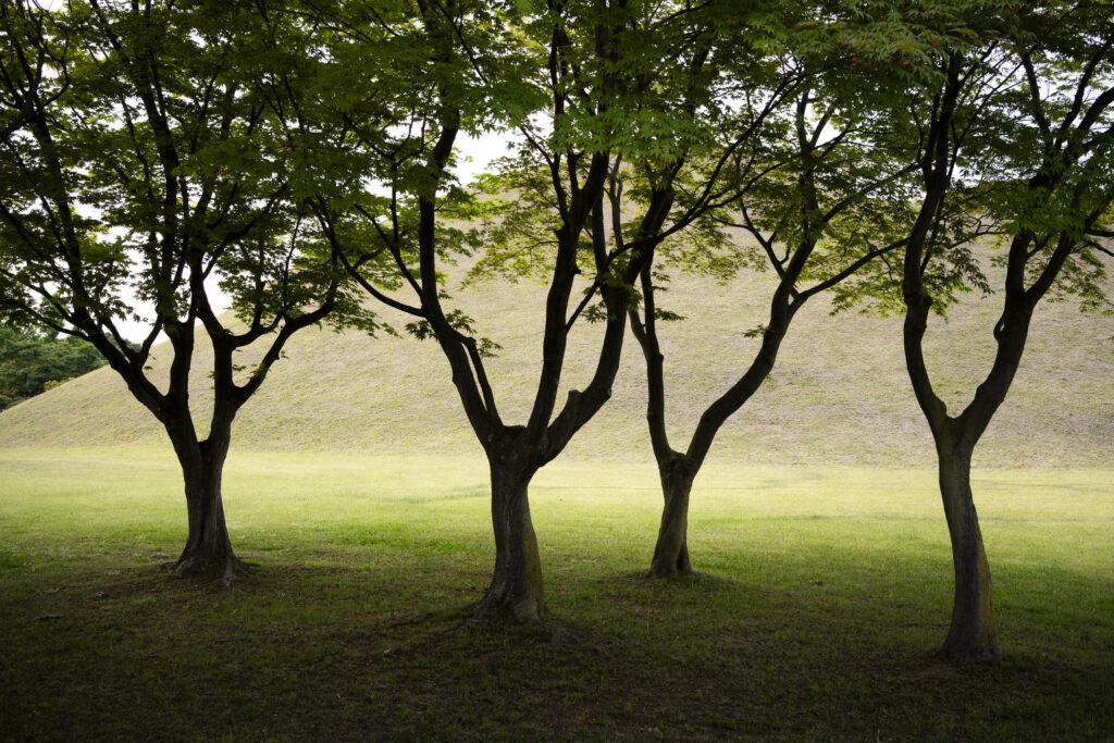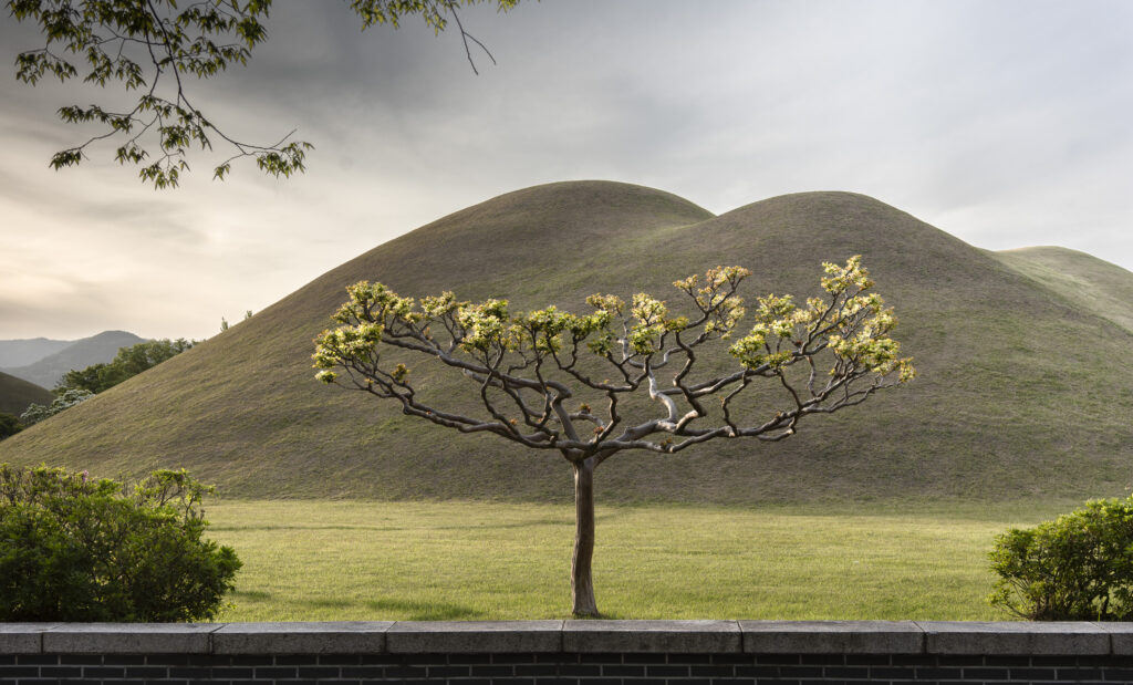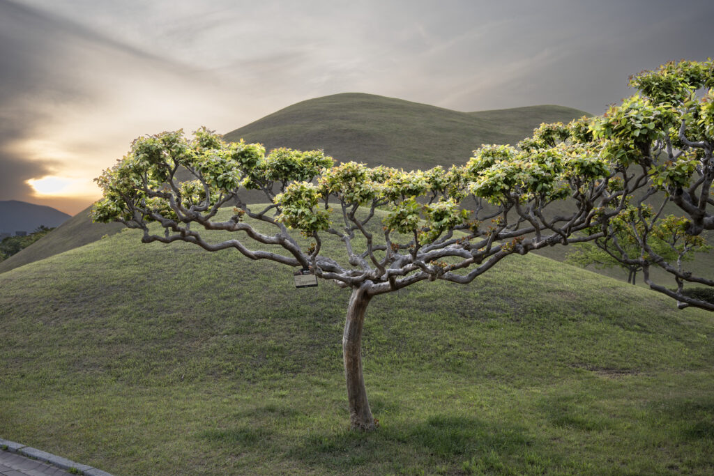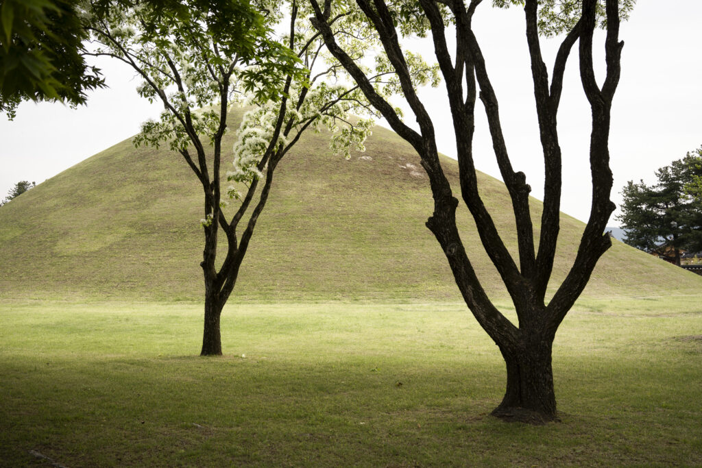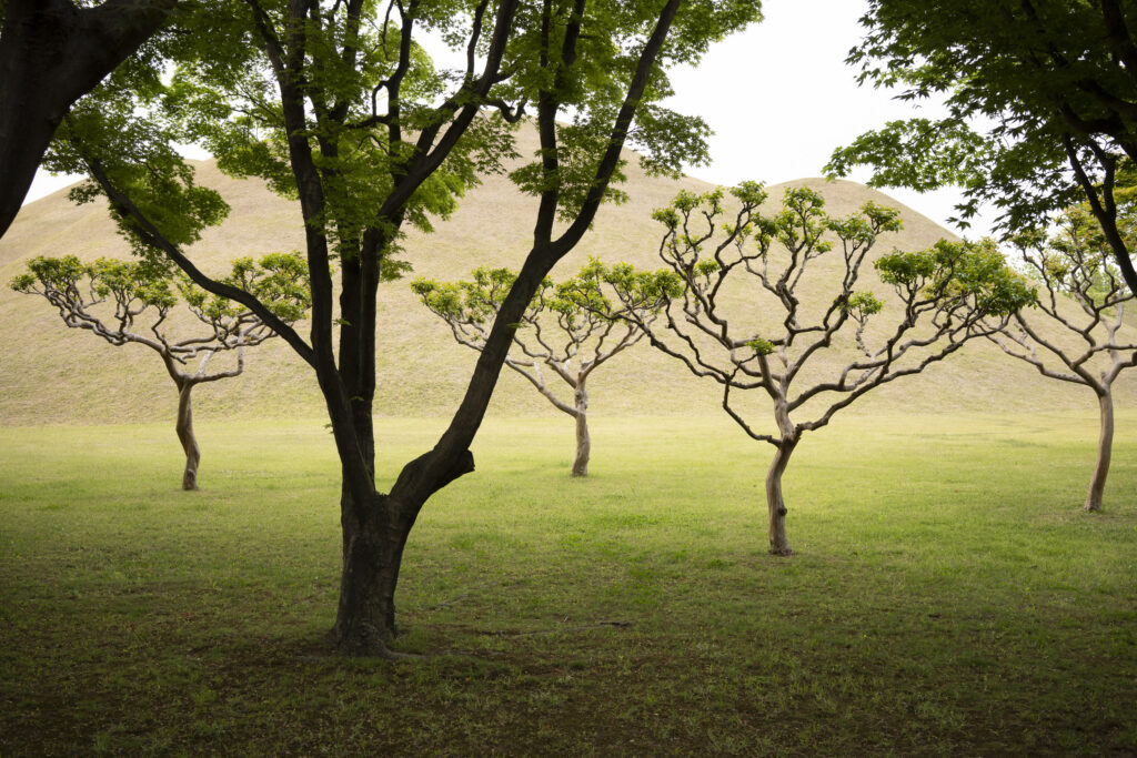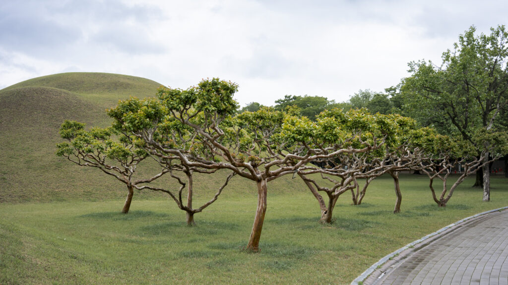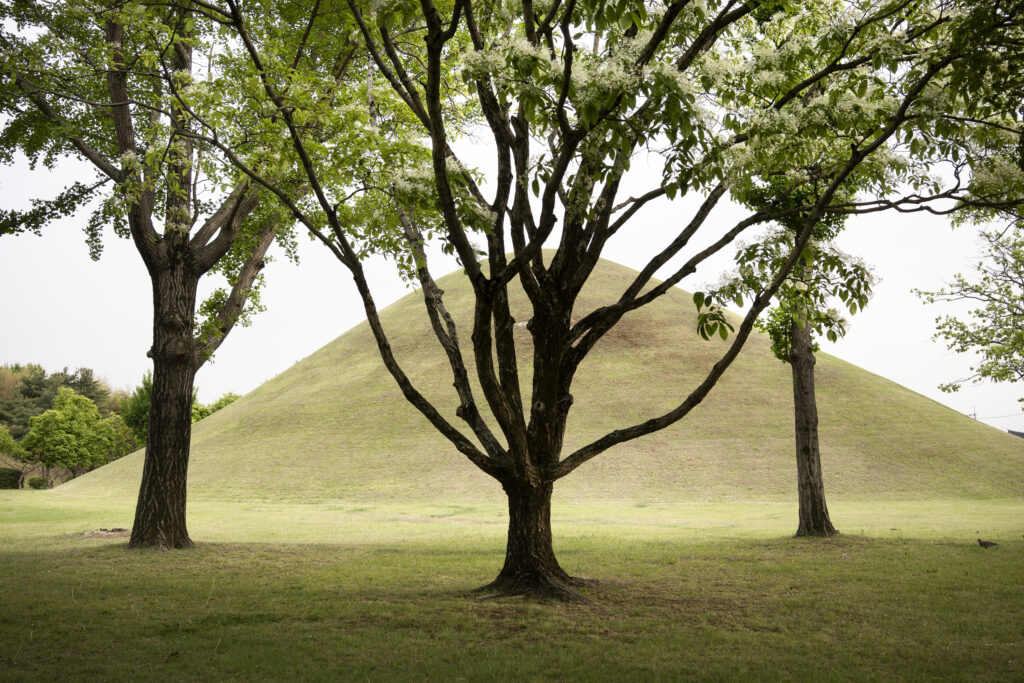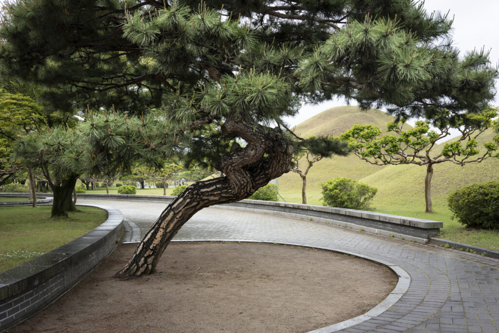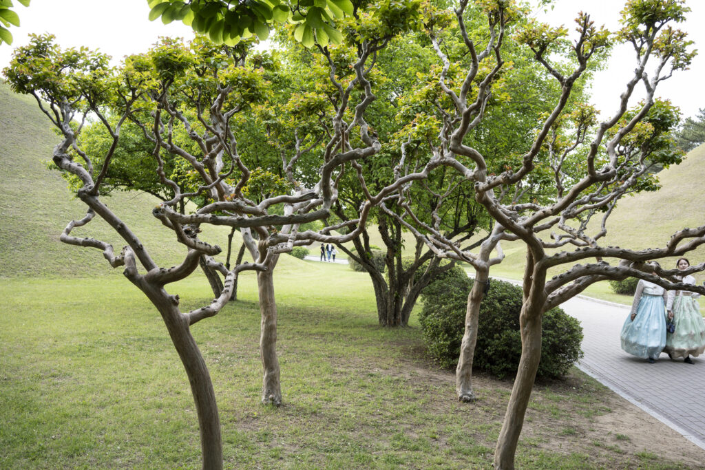 A trio of tall pines stands beside twin burial mounds. Trees in the tomb complex that stand somewhat isolated like this appear to be the result of careful consideration for creating visual and spatial relationships between the tree forms and the mounds.Visitors can walk through a tunnel into the burial chamber deep within the Cheonmachong tomb to view replicas of some of the contents which were removed during its excavation in 1973. Of the 23 large mounds in the tomb complex, only nine have been excavated – and Cheonmachong is the only tomb on view.A closer look at the crown, the elaborate necklace, and adjacent gold objects gives a hint of the skillful craftsmanship. The cashew-shaped jade pieces (called gogok) hanging from elements of the crown and necklace are thought to have symbolized fertility and abundance.A large shade tree has been allowed to mature on a small mound. In its younger life it must have been considered special – hopefully whoever is buried there hasn’t minded. The tree’s branches follow the outlines of the mounds beyond, and reach out to touch a pine branch on the left.In a wider view of the scene, the tree’s thick trunks twist and lean at a low angle over the gap between the mounds, and support an impressively broad canopy. This is one of a series of photographs I took from within the shade of a small grove. Looking out at a pair of isolated trees, their forms are silhouetted against the adjacent mound. The tree on the right has been trimmed to achieve a particular aesthetic – a more two-dimensional form with a graphic quality.Japanese maples frame a group of small nicely shaped crepe myrtles, with single trunks and upstretched arms. There is enough space around each of the crepe myrtles to appreciate their carefully managed forms. Three trees have been placed so their arrangement is symmetrical when aligned with the mound beyond. Four Japanese maples spaced and trimmed so their forms create a repetition of outstretched limbs with a sense of human form.A group of crepe myrtles adjacent to a path with two young women in traditional Korean hanbok dress.The gentle curves of the path and a low railing enclose an enormous old tree trunk at the perimeter of the tomb complex.Korean pines with tall bare trunks. In a grove the textured bark of these trunks and their forms make for interesting compositions.A specimen pine reaches out over the path. The path’s pavers have been set back from the leaning trunk to protect the tree from people traffic, and to allow for space for the roots below the bare ground. A gentle rain has deepened the green colors along this path. A grove of small pines, one with a distinctive elbow-like branch. The soft color of the blue-green needles contrasts with the bright greens from new Japanese maple leaves in the upper left.An exuberant troupe of crepe myrtles – somewhat like a group of expressive dancers. These trees appear to have been trimmed and shaped to evoke elements of the human form. A small grove of Japanese maples with a beautiful light green canopy of new leaves.A visitor on a quiet walk through the burial mounds as the sun sets. The angled boxes on the ground are part of an art installation.A young family sits by a small mound with a gentle shape and slope. The leaves above catch light from the setting sun. These kinds of spaces invite contemplation.The framing of the trees by flanking mounds, along with the backdrop of the larger twin mound, make this a popular spot for photos – so much so that the path is reinforced with a grid.Here’s the scene without the people.A crepe myrtle’s outstretched arms catches light from the setting sun. Trimming and shaping such trees is an art – this one is a good example of that.A pair of crepe myrtles as the sun drops below the surrounding mountains.Light from the setting sun lights up this crepe myrtle’s new leaves as if they were blossoms.