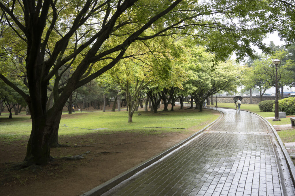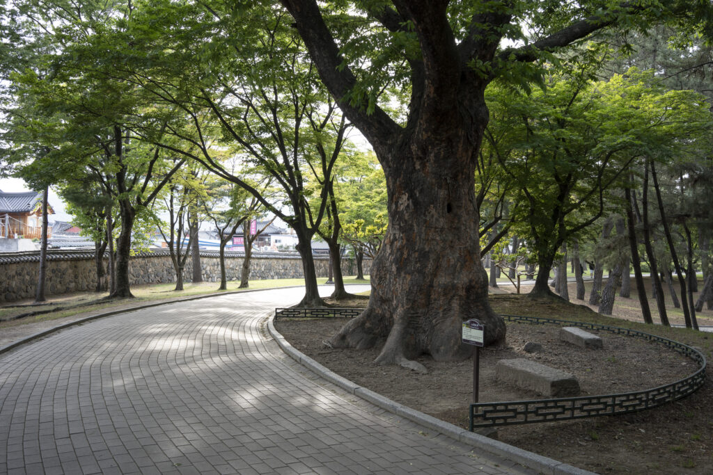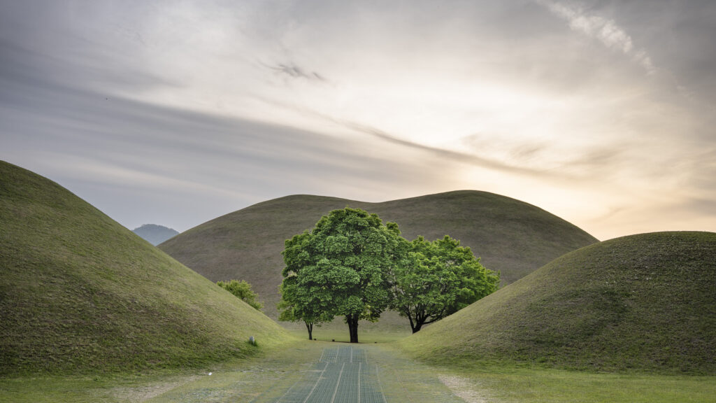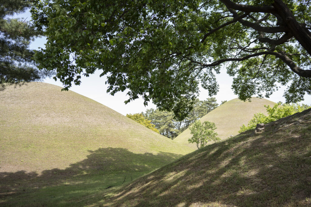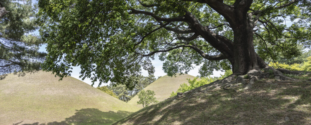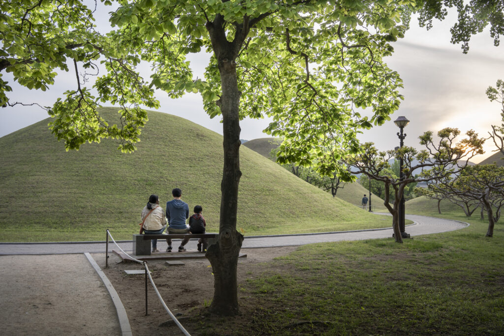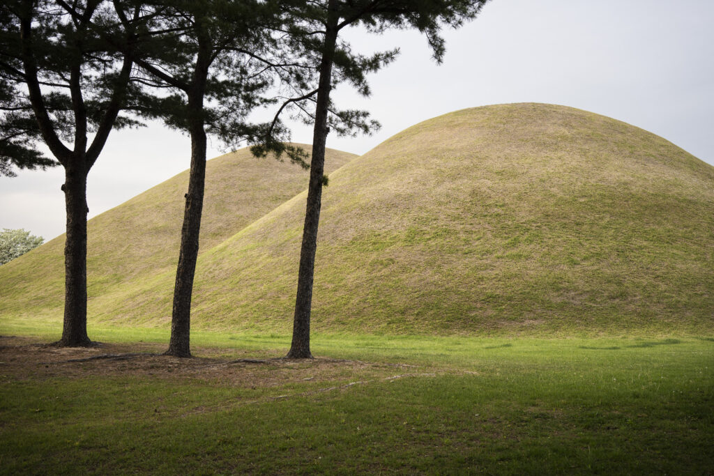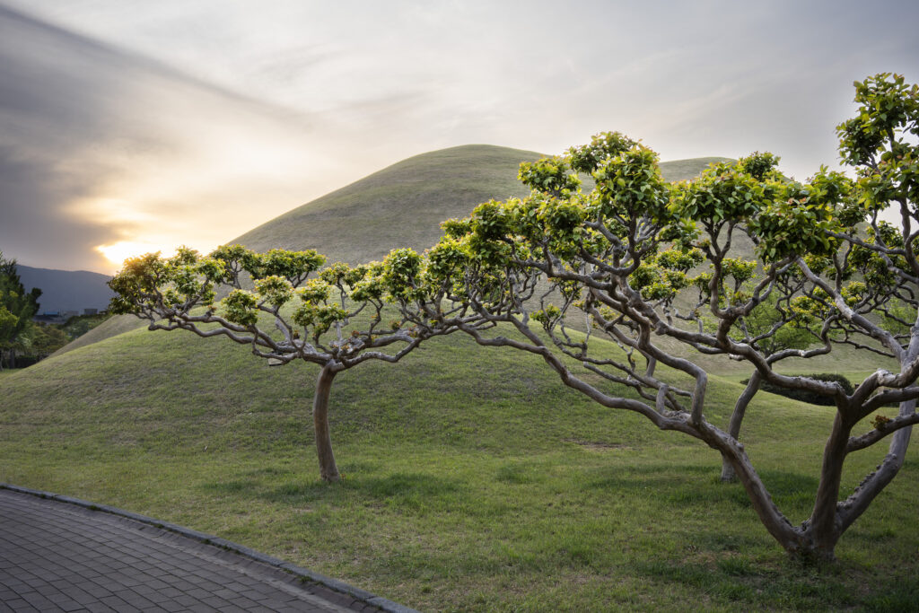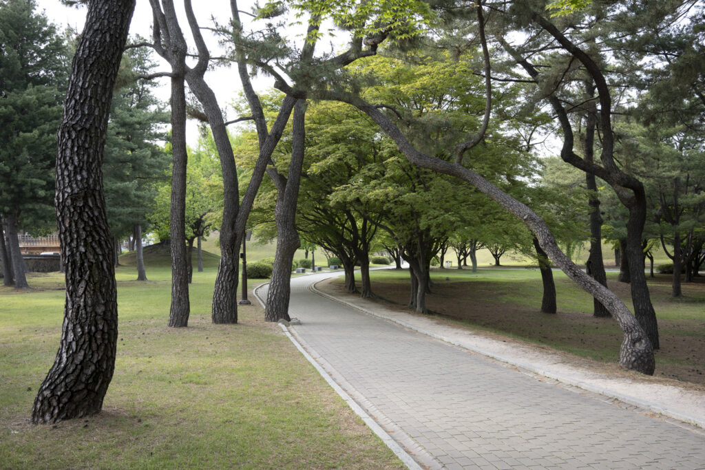 A trio of tall pines stands beside twin burial mounds. Trees in the tomb complex that stand somewhat isolated like this appear to be the result of careful consideration for creating visual and spatial relationships between the tree forms and the mounds.Visitors can walk through a tunnel into the burial chamber deep within the Cheonmachong tomb to view replicas of some of the contents which were removed during its excavation in 1973. Of the 23 large mounds in the tomb complex, only nine have been excavated – and Cheonmachong is the only tomb on view.A closer look at the crown, the elaborate necklace, and adjacent gold objects gives a hint of the skillful craftsmanship. The cashew-shaped jade pieces (called gogok) hanging from elements of the crown and necklace are thought to have symbolized fertility and abundance.A large shade tree has been allowed to mature on a small mound. In its younger life it must have been considered special – hopefully whoever is buried there hasn’t minded. The tree’s branches follow the outlines of the mounds beyond, and reach out to touch a pine branch on the left.In a wider view of the scene, the tree’s thick trunks twist and lean at a low angle over the gap between the mounds, and support an impressively broad canopy. This is one of a series of photographs I took from within the shade of a small grove. Looking out at a pair of isolated trees, their forms are silhouetted against the adjacent mound. The tree on the right has been trimmed to achieve a particular aesthetic – a more two-dimensional form with a graphic quality.Japanese maples frame a group of small nicely shaped crepe myrtles, with single trunks and upstretched arms. There is enough space around each of the crepe myrtles to appreciate their carefully managed forms. Three trees have been placed so their arrangement is symmetrical when aligned with the mound beyond. Four Japanese maples spaced and trimmed so their forms create a repetition of outstretched limbs with a sense of human form.A group of crepe myrtles adjacent to a path with two young women in traditional Korean hanbok dress.The gentle curves of the path and a low railing enclose an enormous old tree trunk at the perimeter of the tomb complex.Korean pines with tall bare trunks. In a grove the textured bark of these trunks and their forms make for interesting compositions.A specimen pine reaches out over the path. The path’s pavers have been set back from the leaning trunk to protect the tree from people traffic, and to allow for space for the roots below the bare ground. A gentle rain has deepened the green colors along this path. A grove of small pines, one with a distinctive elbow-like branch. The soft color of the blue-green needles contrasts with the bright greens from new Japanese maple leaves in the upper left.An exuberant troupe of crepe myrtles – somewhat like a group of expressive dancers. These trees appear to have been trimmed and shaped to evoke elements of the human form. A small grove of Japanese maples with a beautiful light green canopy of new leaves.A visitor on a quiet walk through the burial mounds as the sun sets. The angled boxes on the ground are part of an art installation.A young family sits by a small mound with a gentle shape and slope. The leaves above catch light from the setting sun. These kinds of spaces invite contemplation.The framing of the trees by flanking mounds, along with the backdrop of the larger twin mound, make this a popular spot for photos – so much so that the path is reinforced with a grid.Here’s the scene without the people.A crepe myrtle’s outstretched arms catches light from the setting sun. Trimming and shaping such trees is an art – this one is a good example of that.A pair of crepe myrtles as the sun drops below the surrounding mountains.Light from the setting sun lights up this crepe myrtle’s new leaves as if they were blossoms.