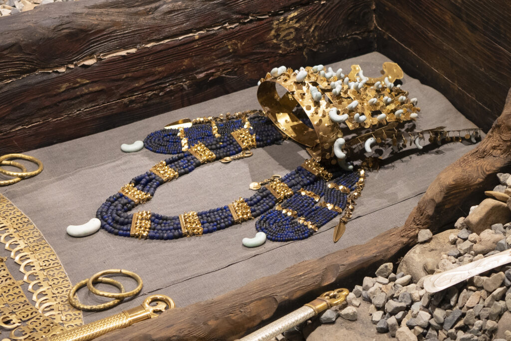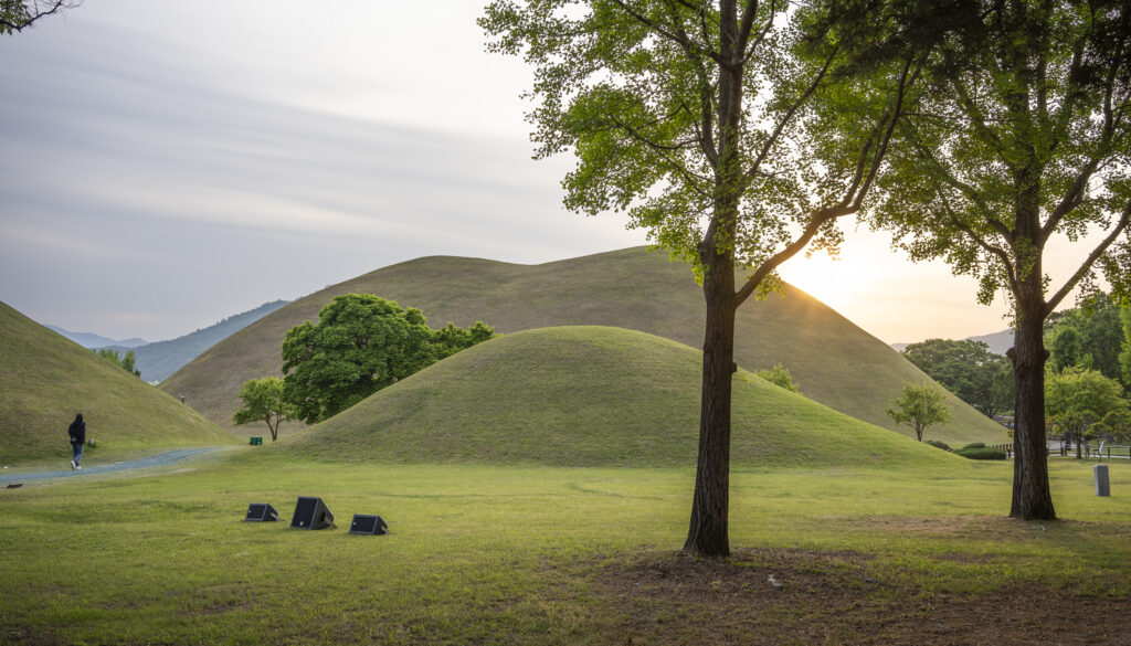 The Daereungwon tomb complex in central Gyeongju is the site of about two dozen Silla royal tomb mounds (also called tumuli) that are the backdrop to the photographs in this post. The thousands of artifacts excavated during the 20th century from nine of the tombs have included exceptional examples of crowns and jewelry, as well as luxury goods from Silk Road trade (Central Asian and Mediterranean glassware, fine fabrics, and precious metals) that indicate the importance of the Silla dynasty in the world in those times.
