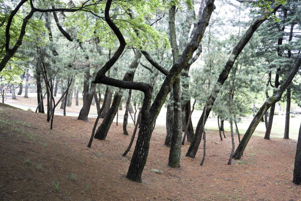 In this post the focus is on the mounds themselves and the adjacent treescapes. The mounds serve as a calm backdrop to the interesting tree arrangements that have been developed by planners and keepers over a long period of time. The many crepe myrtles, Japanese maples, Korean pines, and other species have been shaped into forms that are often seen against the bare mounds from views that invite careful inspection and contemplation. The landscape within the park appears to have been refined into a conversation with the mounds.