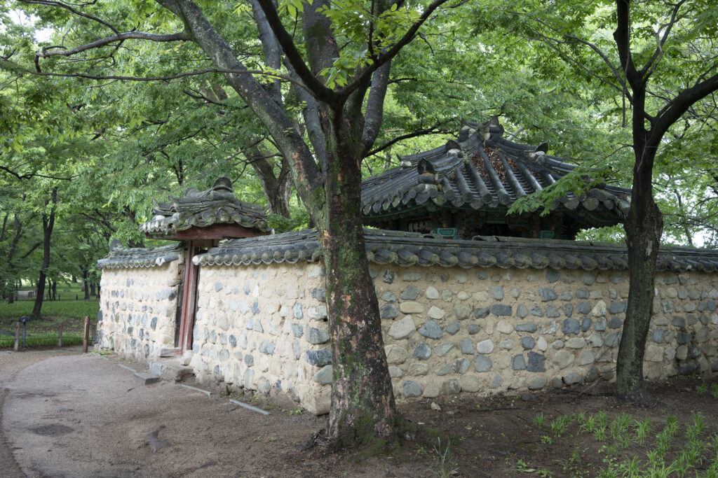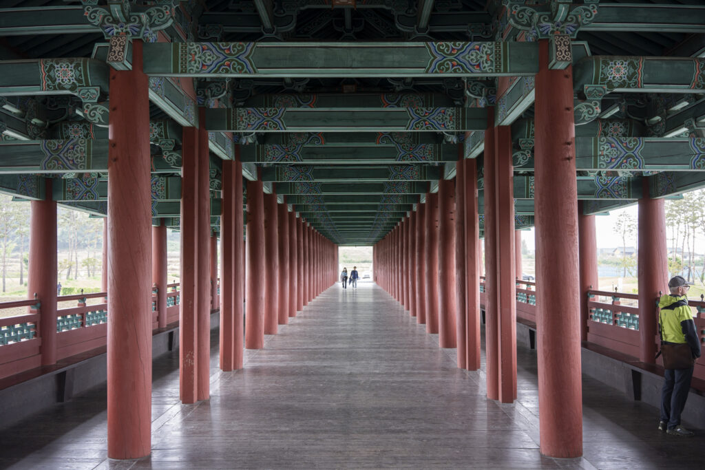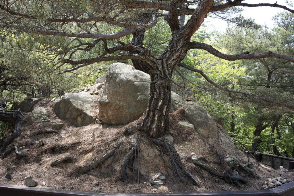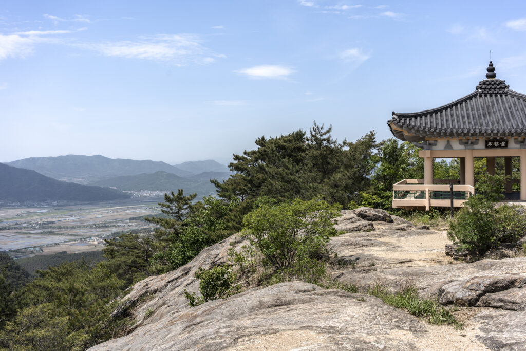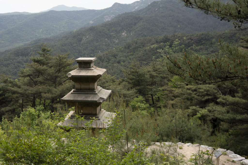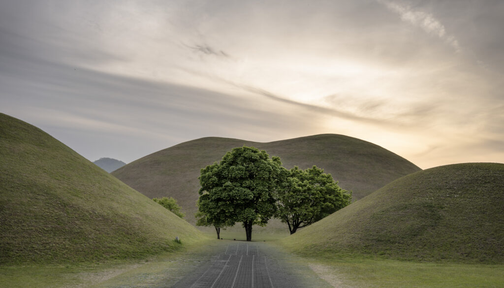 Gyeongju, a city near the southeast coast of the Korean peninsula, was once the capital of Silla, a kingdom that existed for about a thousand years, from the 1st century BCE to the 10th century CE. In my previous post I shared photographs of a park-like complex of royal Silla tomb mounds that I admired for the carefully places trees and landscaping that complemented the hill-sized mounds. In this post I’m taking us outside that historic feature of Gyeongju into adjacent areas that have more of the city’s past. It’s easy to roam in the past if you follow the routes that I took, including: To an adjacent expansive park that contains more tomb mounds, as well as the remnants of defensive fortifications for the main Silla palace compound; to a hike up and along the ridge of nearby Namsan mountain, dotted with small Buddhist shrines, and with soft trails carpeted with pine needles; to the Gyeongju National Museum, with its excellent displays of archeological finds and royal artifacts; to a little village of historic structures that preserves the small-scale architecture of the time; and to a beautiful small forest that was the site of an interesting myth.