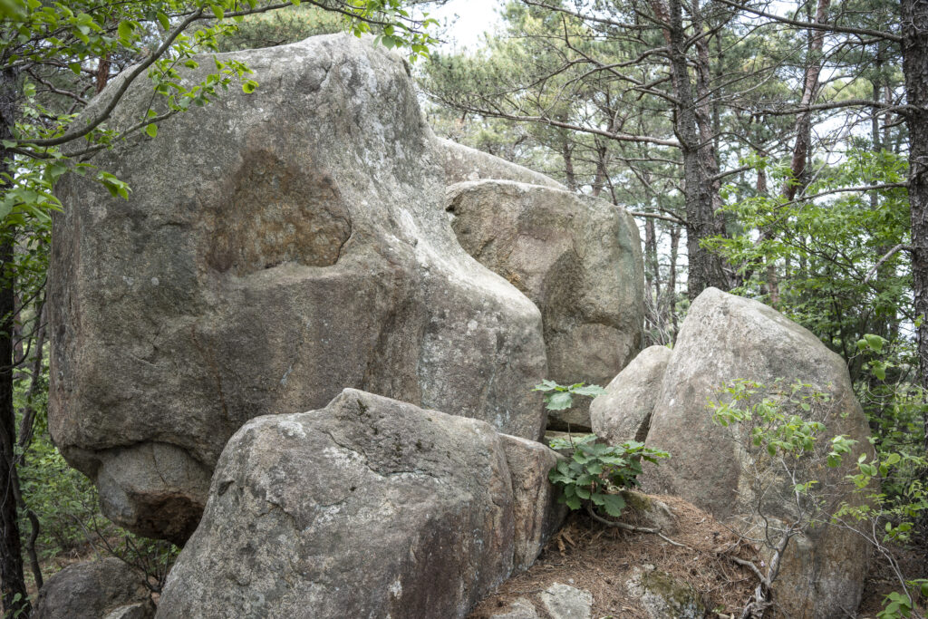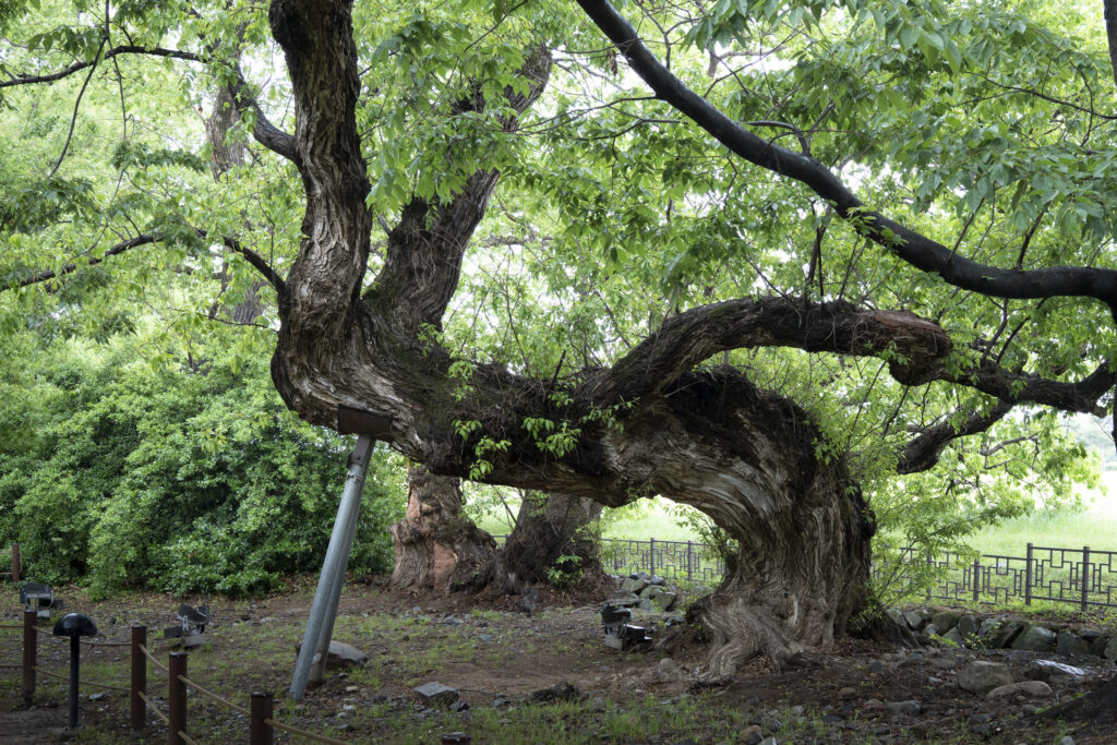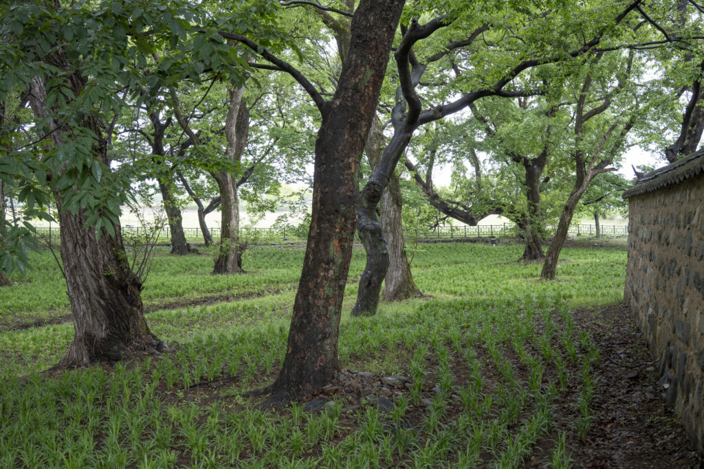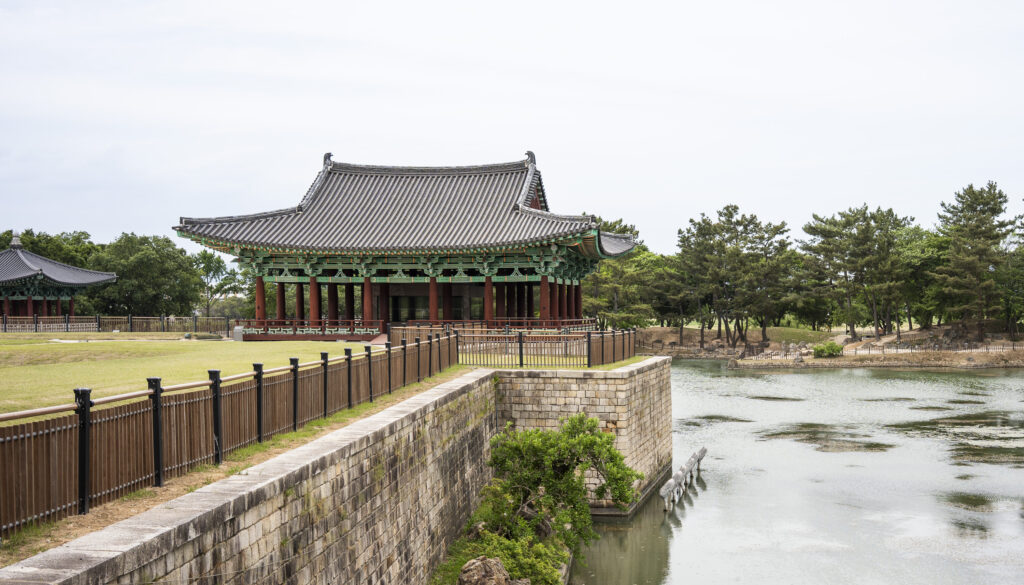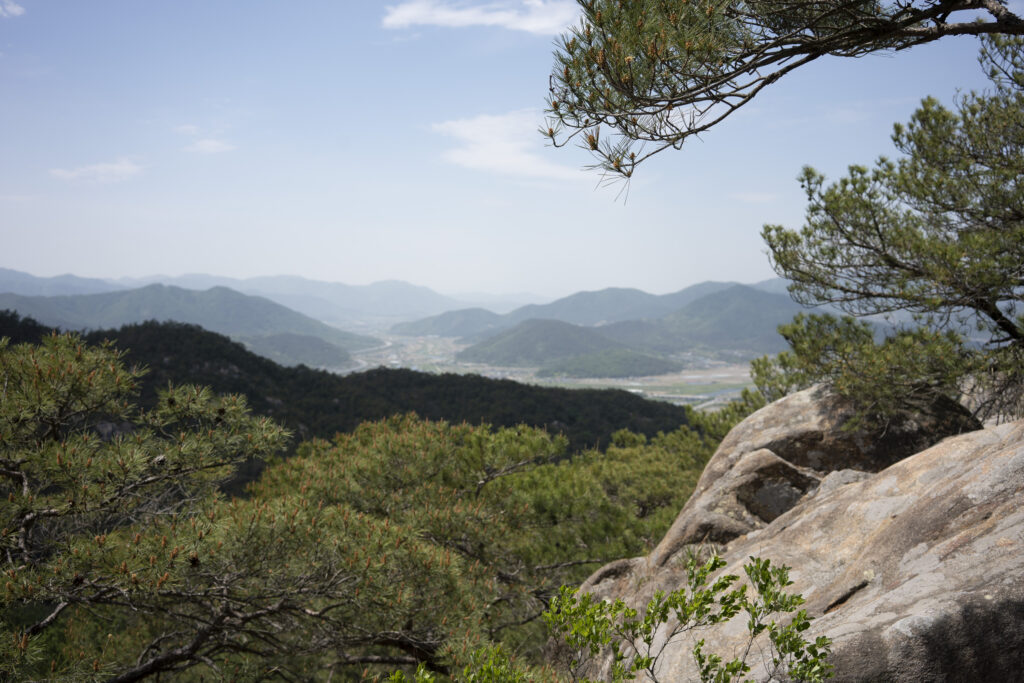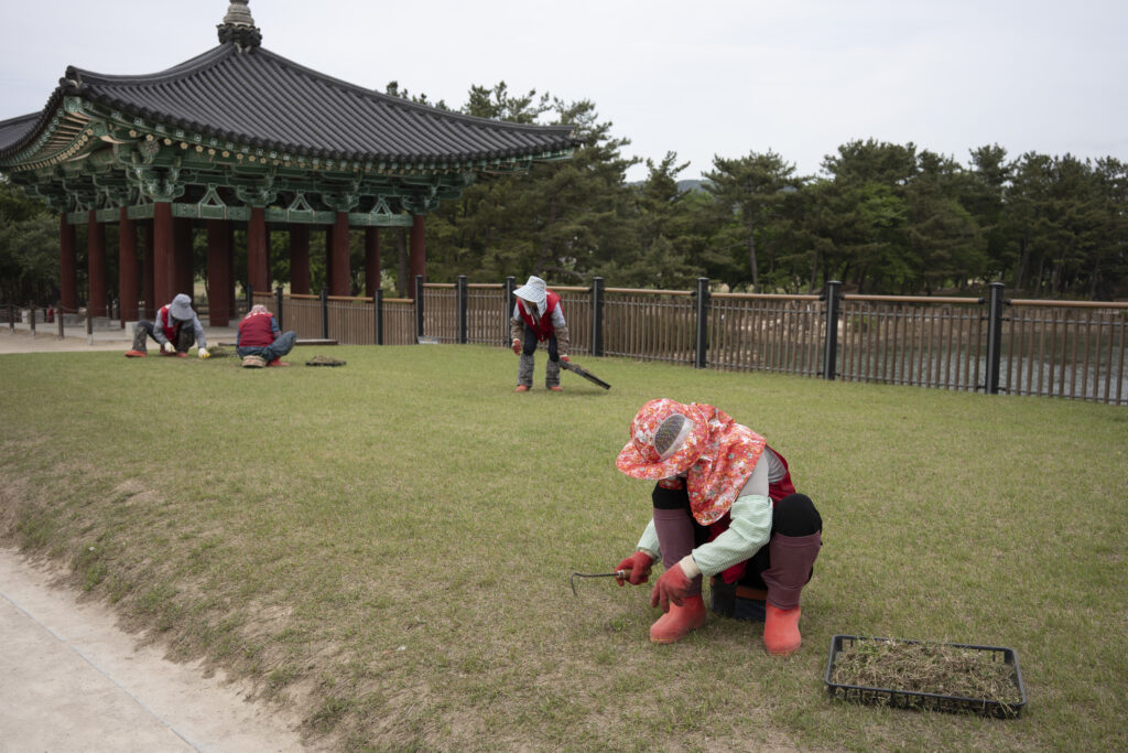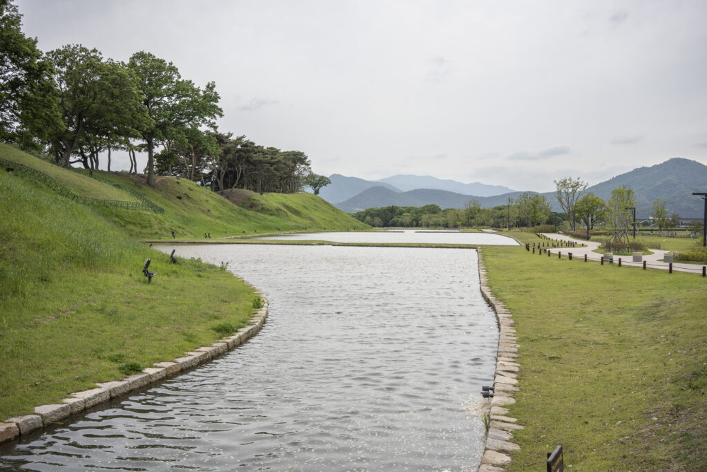 Gyeongju, a city near the southeast coast of the Korean peninsula, was once the capital of Silla, a kingdom that existed for about a thousand years, from the 1st century BCE to the 10th century CE. In my previous post I shared photographs of a park-like complex of royal Silla tomb mounds that I admired for the carefully places trees and landscaping that complemented the hill-sized mounds. In this post I’m taking us outside that historic feature of Gyeongju into adjacent areas that have more of the city’s past. It’s easy to roam in the past if you follow the routes that I took, including: To an adjacent expansive park that contains more tomb mounds, as well as the remnants of defensive fortifications for the main Silla palace compound; to a hike up and along the ridge of nearby Namsan mountain, dotted with small Buddhist shrines, and with soft trails carpeted with pine needles; to the Gyeongju National Museum, with its excellent displays of archeological finds and royal artifacts; to a little village of historic structures that preserves the small-scale architecture of the time; and to a beautiful small forest that was the site of an interesting myth.
