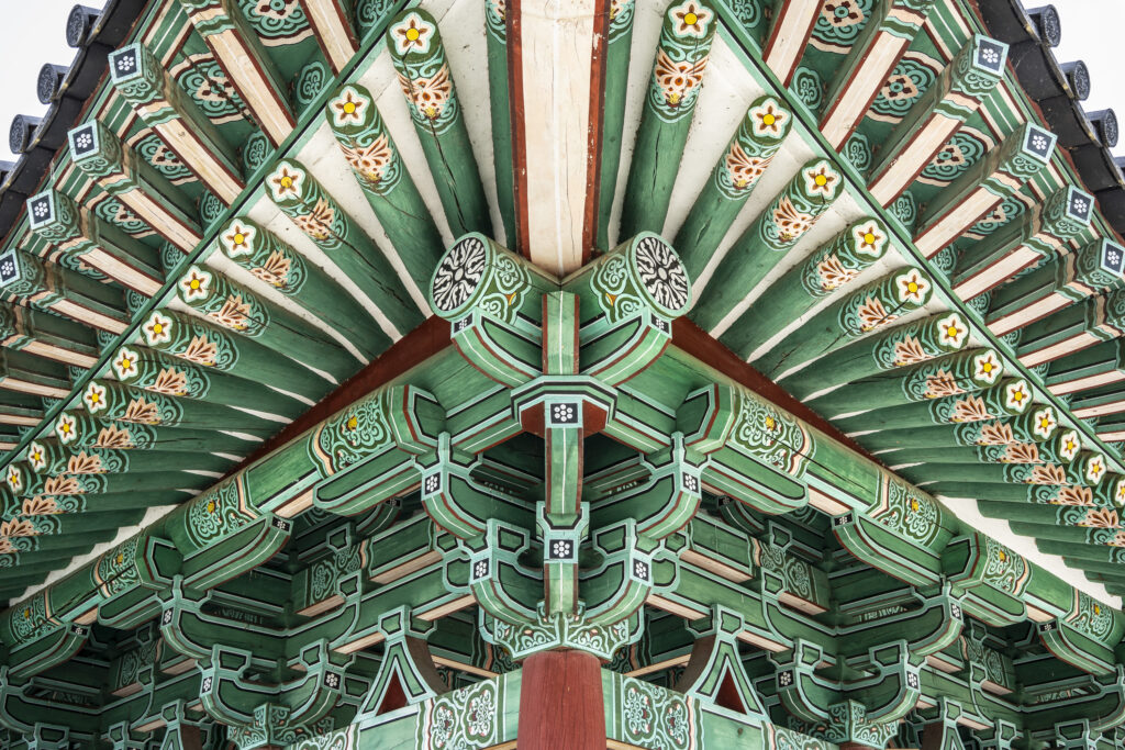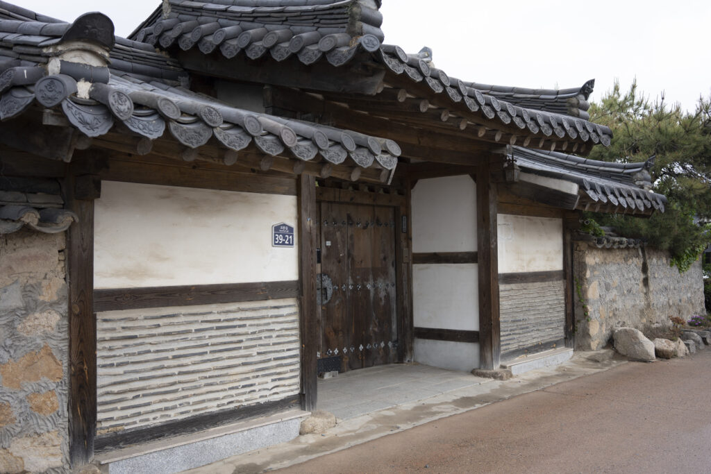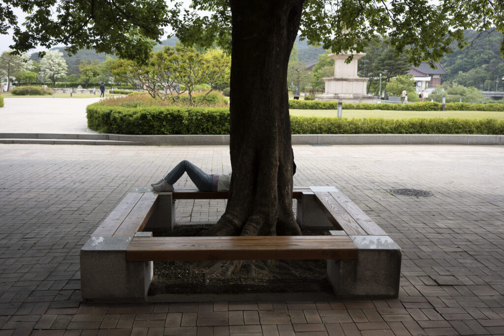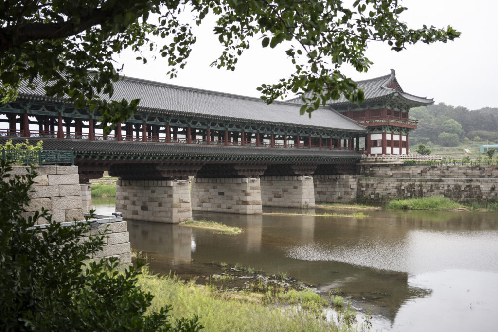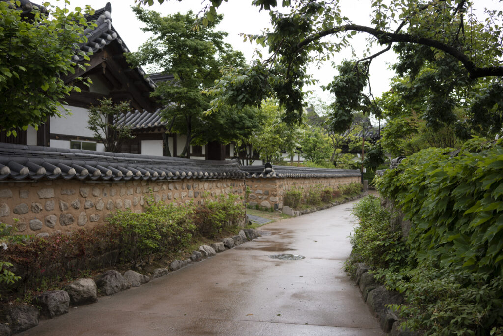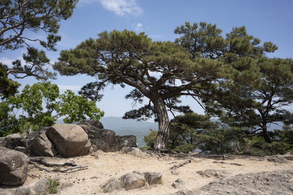 Gyeongju, a city near the southeast coast of the Korean peninsula, was once the capital of Silla, a kingdom that existed for about a thousand years, from the 1st century BCE to the 10th century CE. In my previous post I shared photographs of a park-like complex of royal Silla tomb mounds that I admired for the carefully places trees and landscaping that complemented the hill-sized mounds. In this post I’m taking us outside that historic feature of Gyeongju into adjacent areas that have more of the city’s past. It’s easy to roam in the past if you follow the routes that I took, including: To an adjacent expansive park that contains more tomb mounds, as well as the remnants of defensive fortifications for the main Silla palace compound; to a hike up and along the ridge of nearby Namsan mountain, dotted with small Buddhist shrines, and with soft trails carpeted with pine needles; to the Gyeongju National Museum, with its excellent displays of archeological finds and royal artifacts; to a little village of historic structures that preserves the small-scale architecture of the time; and to a beautiful small forest that was the site of an interesting myth.