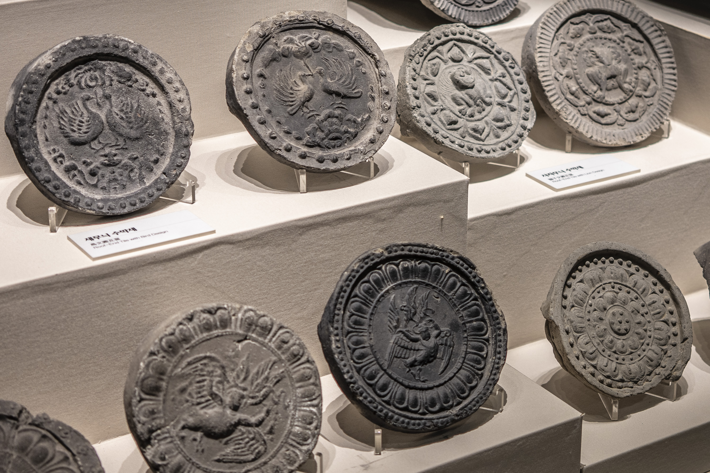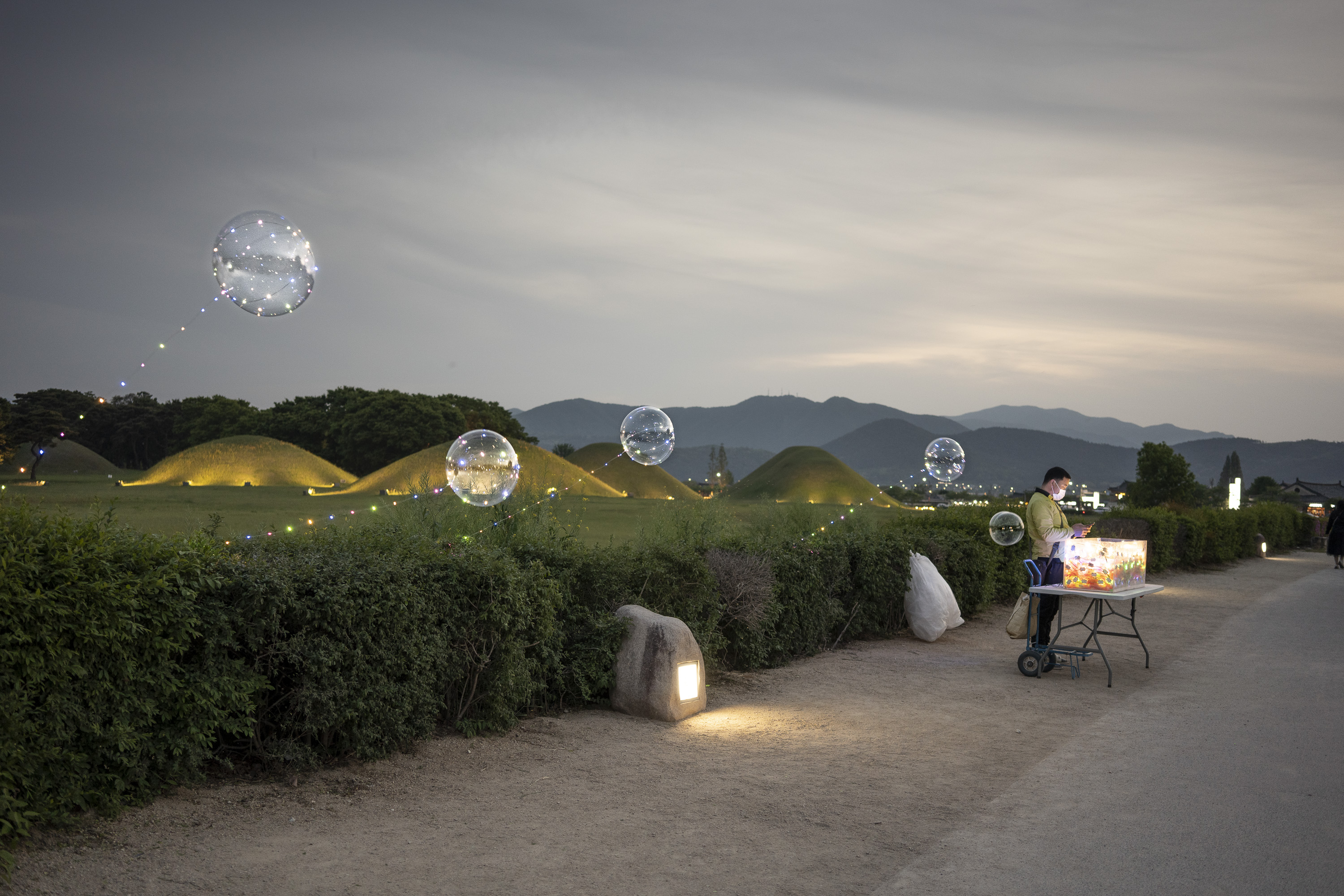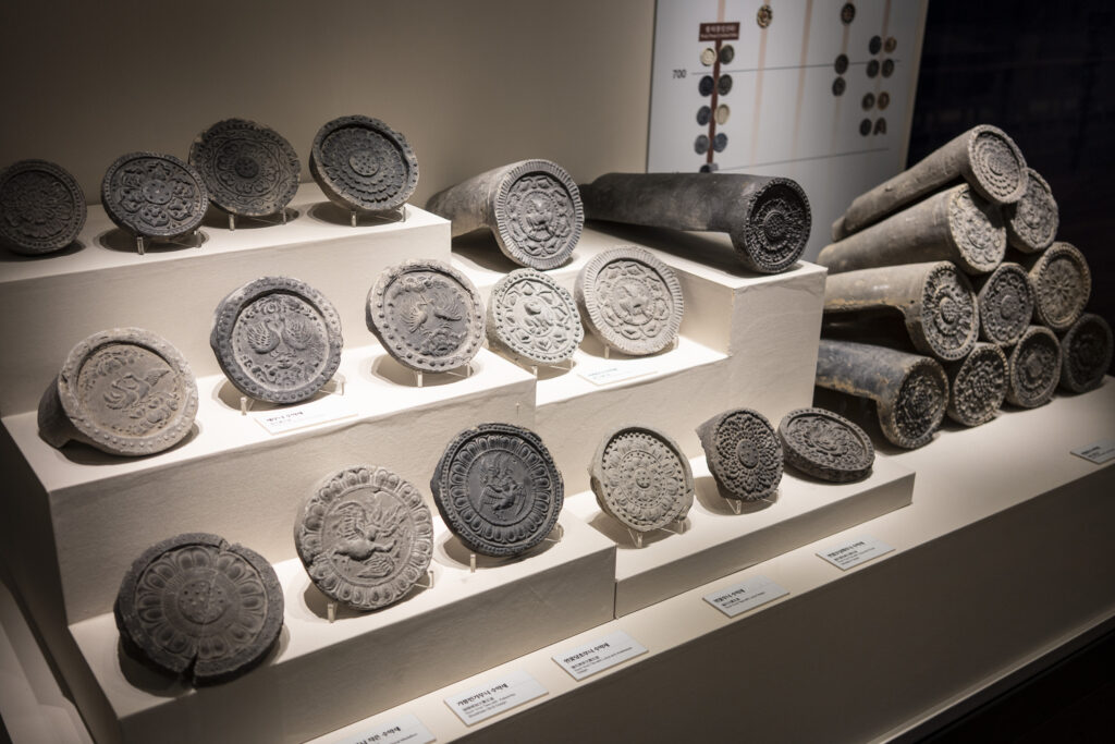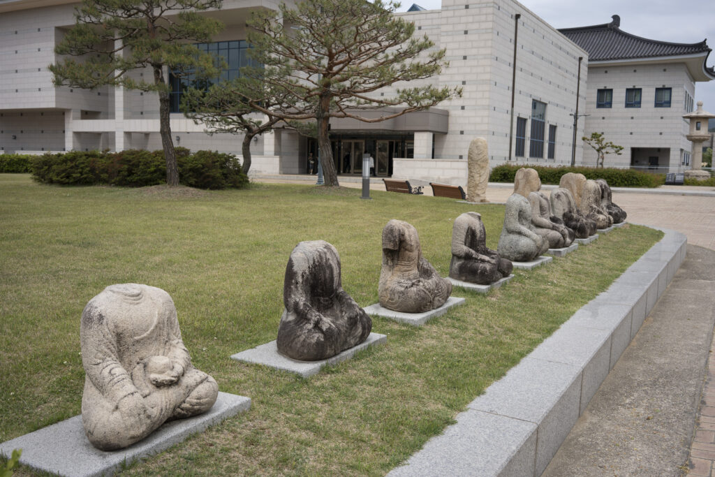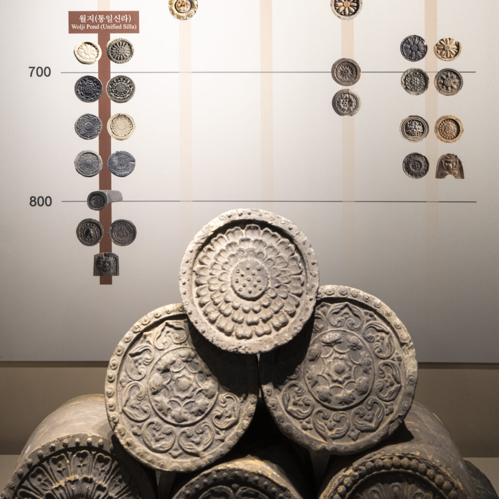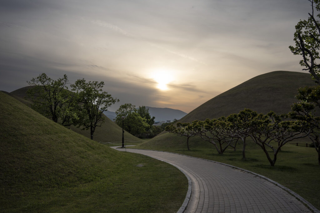 It’s toward the end of the day at the Daereungwon tomb complex, and things have quieted down. This particular spot is a favorite location for visitors to take photos – but they have all left! A small peak of a nearby mountain, on the left, is visible between two mounds. Its slopes seem to match the angles of the mounds.Within the complex, the sun is about to set behind the distant mountain ridge. This group of burial mounds is about to fade into the night. The distinctively shaped crepe myrtles lining the path are still catching a bit of sunlight.A short distance outside the Daereungwon tomb complex, the expansive Wolseong historic district park contains additional tombs (lit in the background), as well as remnants of the palaces and fortifications of the Silla dynasty. Here a vendor’s balloons, sparkling with LED lights, trace the direction of the breeze. It’s a quiet scene, with mountain ridges in the background stepping back in overlapping shades of lightening greys.Paths outside the wall that follow the perimeter of the tomb complex are nicely lit.The trees outside the wall appear to be shaped and maintained as carefully as those within. The next morning I hike a trail up Namsan Mountain, a ridge just south of Gyeongju that contains many (almost 130) Buddhist statues. They are among many hundreds of cultural heritage sites found in the ridges and crevices of the mountain – including remnants of Silla fortifications built to defend the city. Much of the trail is carpeted with a soft blanket of pine needles.A little three-story stone pagoda from the 9th century stands at the high point of what was a former temple complex. An information plaque states that the pagoda was discovered collapsed, and then reassembled in 2001. At the corners of each roof stone there apparently are/were small holes for hanging wind chimes.A small Buddha was carved into this stone outcropping in the early 7th century, which apparently makes it the earliest depiction of Buddha on Namsan Mountain. From the information plaque: “It has a round face and leans slightly forward, with large eyes, a faint smile, and a peaceful expression.”An interesting group of large stones – warm-colored granite in soft shapes.A nice outlook toward the north, with mountains rising from the flat Gyeongju Basin on which the city was built.Korean pines have beautiful and distinctive shapes. Namsan Mountain is known for its Korean Pines and Korean Red Pines. A small shelter at the top of the trail looks out over Gyeongju and the Hyeongsan River plain, part of the larger Gyeongju Basin.On the trail back down toward the city there is a project underway to stabilize or perhaps reconstruct a Silla fortification from the 6th century. Monuments from the time of the construction of the fortress’s walls stated: “People from all over the country gathered and were given a fixed length of the wall to build. If the wall falls down within three years, then those responsible shall be punished.”!Great respect is given to the old pine trees along the trail. This one grew out of a jumble of boulders, and is protected by a low wall.Having come down off of Namsan Mountain, it is not a long walk to the Gyeongju National Museum. The museum is a campus of buildings, each with a focus on a historical era, or collection of art or artifacts.A group of headless carved stone Buddhas (from the 8th-9th centuries) are on display on the grounds of the museum. These Buddhas were all found during the excavation of a well adjacent to a 7th century temple in Gyeongju. Why headless? One possible explanation is that they were deliberately disfigured during the Joseon dynasty (14th to 19th centuries), when Confucianism was adopted as the governing ideology of the nation.Inside the museum, a Silla winged gold crown ornament from the 6th century. The piece was made from a single sheet of gold, with small gold discs hung with gold wire. An interesting shape was used repetitively for the cutouts, and the edges are decorated with fine punch marks.This is a quite amazing Silla gold crown, or cap, from the 6th century. It was constructed of thin gold sheets, which were perforated in decorative patterns to let the original inner cloth or leather cap show through. The crown was worn over the head, with an area (on the right side of the photo) more open for visibility from within.Here is a detail of the gold crown/cap, showing the fine patterns that were cut and punched into the gold plates.This is another of the museum’s showpieces of Silla crown design and craftsmanship from the 6th century. “Trees” crafted from sheets of gold are hung with hundreds of gold spangles and cashew-shaped jade pieces (symbolizing fertility).More down-to-earth are these ceramic roof-end tiles with intricate bird, lotus, and lion designs.Here’s a closer look at some of the beautifully detailed roof-end tile designs.An interesting chart (partially shown) shows how roof-end tile designs progressed from the 5th to the 9th centuries in different regions of Korea, as well as in China and Japan. The Wolji Pond note on the chart indicates that the tiles in that group were excavated from Wolji Pond (adjacent to a royal compound), where thousands of artifacts from the Silla era have been found.A beautiful example of a Silla-era roof ridge end tile. Ridge end tiles were designed to protect against weather and fire, as well as evil spirits.This large panoramic rendering was on an information panel in the historic district. It shows how Gyeongju might have been laid out during a period of the Silla dynasty. Certain elements, such as the palace structures, the defensive ridge in the foreground, and the burial mounds on the far left, may be positioned according to what archeologists know about their historic locations.Donggung Palace and its Wolji Pond were the location of one of the Silla royal compounds. The pond was excavated and rebuilt, along with three of the original structures, in t