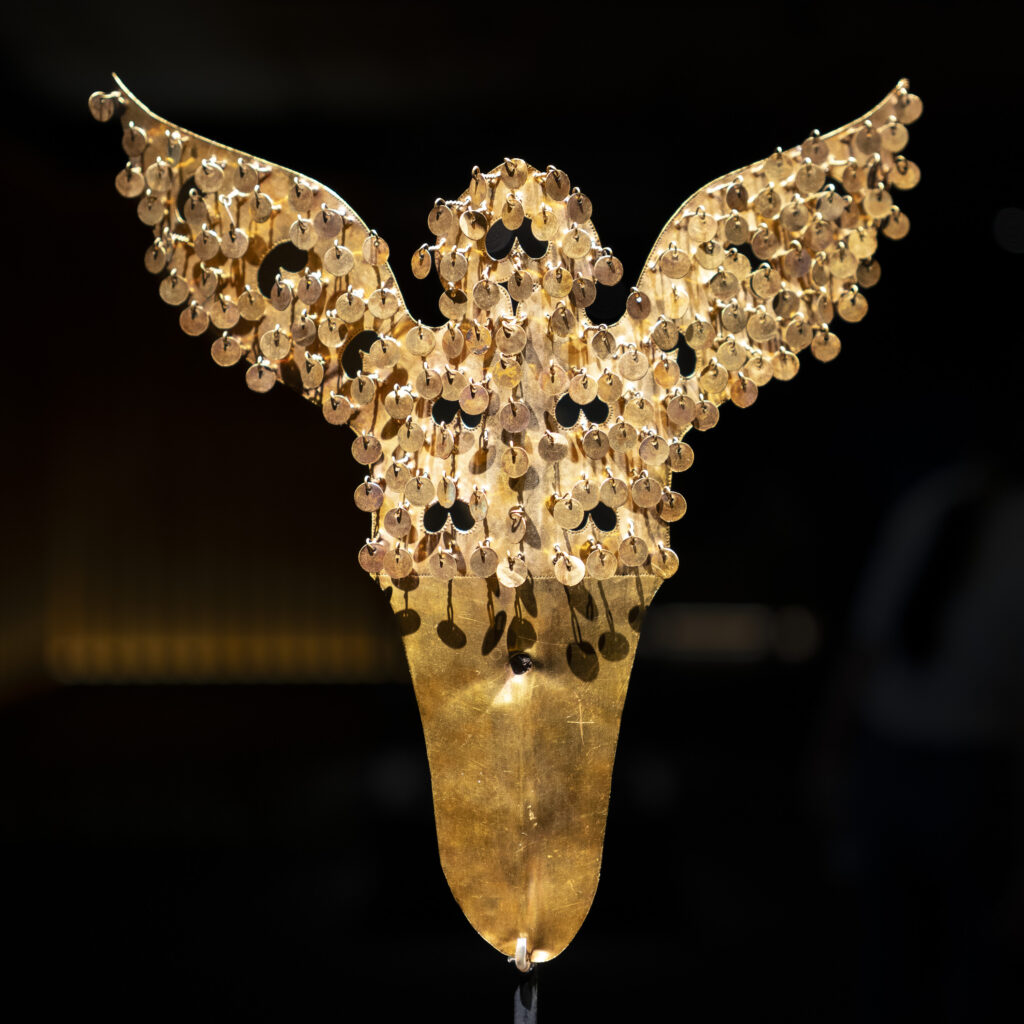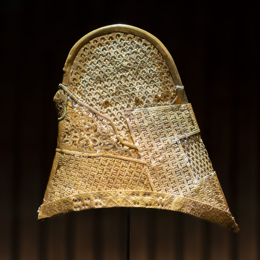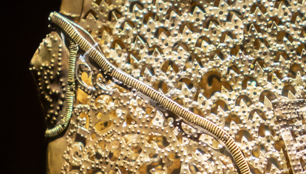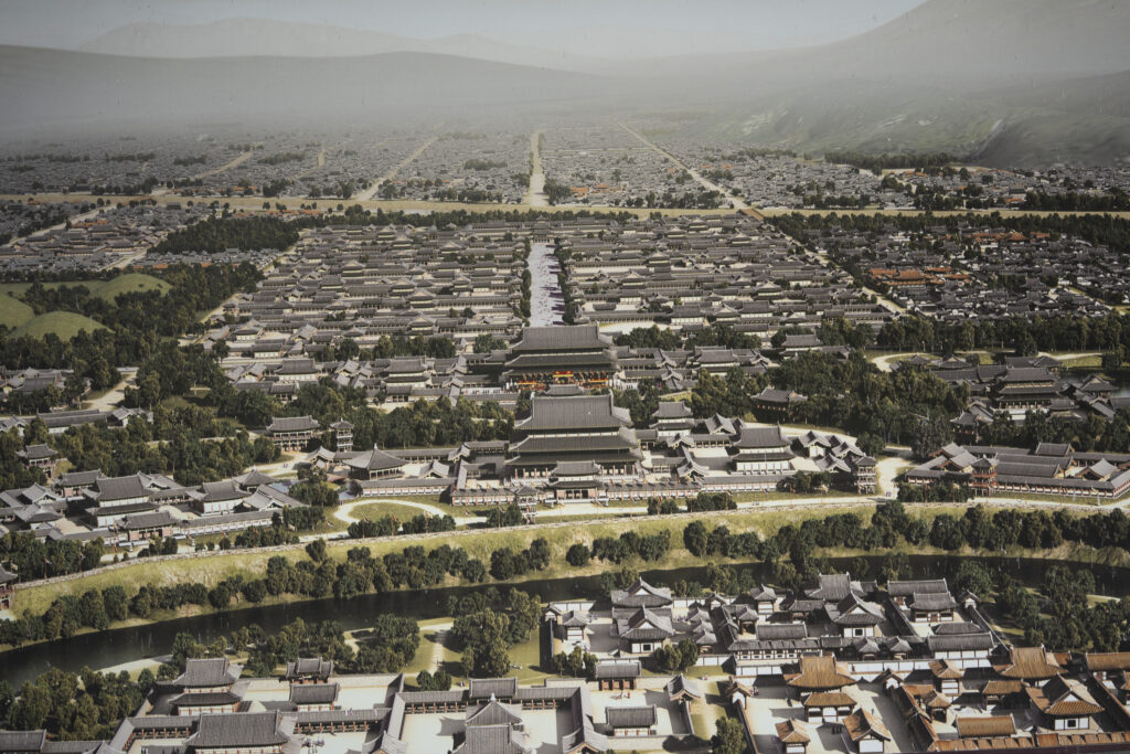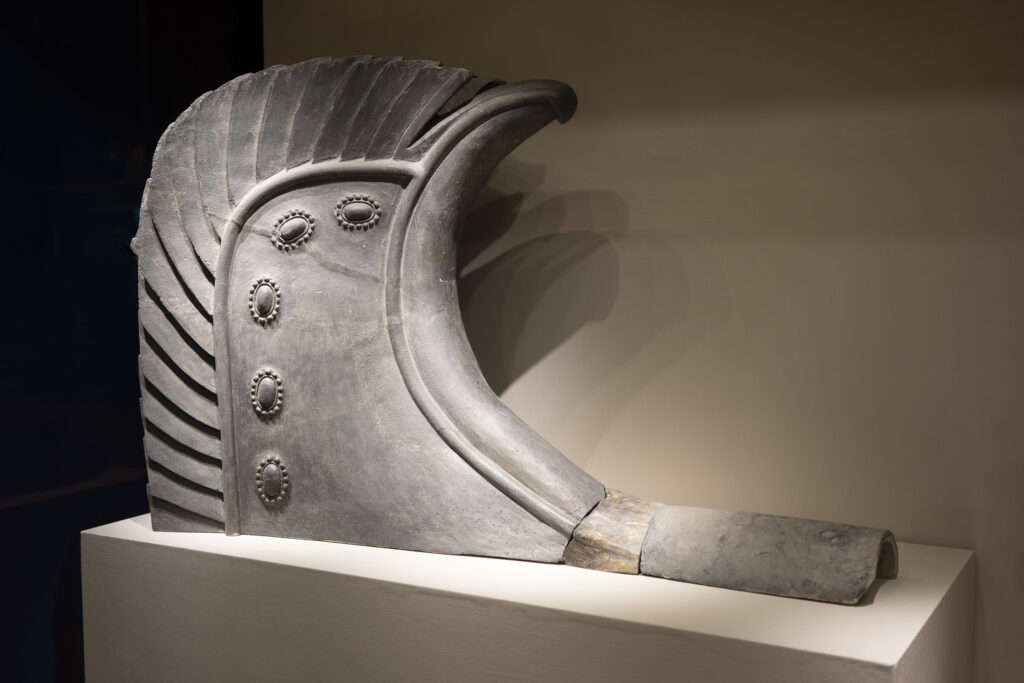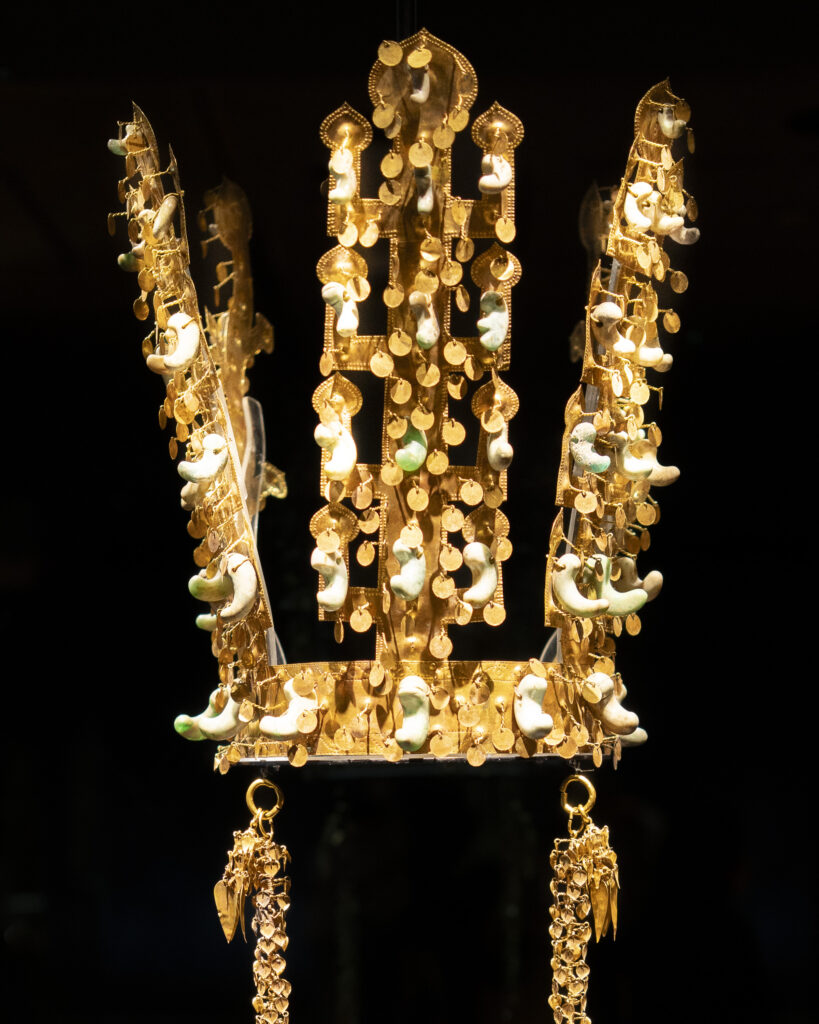 It’s toward the end of the day at the Daereungwon tomb complex, and things have quieted down. This particular spot is a favorite location for visitors to take photos – but they have all left! A small peak of a nearby mountain, on the left, is visible between two mounds. Its slopes seem to match the angles of the mounds.Within the complex, the sun is about to set behind the distant mountain ridge. This group of burial mounds is about to fade into the night. The distinctively shaped crepe myrtles lining the path are still catching a bit of sunlight.A short distance outside the Daereungwon tomb complex, the expansive Wolseong historic district park contains additional tombs (lit in the background), as well as remnants of the palaces and fortifications of the Silla dynasty. Here a vendor’s balloons, sparkling with LED lights, trace the direction of the breeze. It’s a quiet scene, with mountain ridges in the background stepping back in overlapping shades of lightening greys.Paths outside the wall that follow the perimeter of the tomb complex are nicely lit.The trees outside the wall appear to be shaped and maintained as carefully as those within. The next morning I hike a trail up Namsan Mountain, a ridge just south of Gyeongju that contains many (almost 130) Buddhist statues. They are among many hundreds of cultural heritage sites found in the ridges and crevices of the mountain – including remnants of Silla fortifications built to defend the city. Much of the trail is carpeted with a soft blanket of pine needles.A little three-story stone pagoda from the 9th century stands at the high point of what was a former temple complex. An information plaque states that the pagoda was discovered collapsed, and then reassembled in 2001. At the corners of each roof stone there apparently are/were small holes for hanging wind chimes.A small Buddha was carved into this stone outcropping in the early 7th century, which apparently makes it the earliest depiction of Buddha on Namsan Mountain. From the information plaque: “It has a round face and leans slightly forward, with large eyes, a faint smile, and a peaceful expression.”An interesting group of large stones – warm-colored granite in soft shapes.A nice outlook toward the north, with mountains rising from the flat Gyeongju Basin on which the city was built.Korean pines have beautiful and distinctive shapes. Namsan Mountain is known for its Korean Pines and Korean Red Pines. A small shelter at the top of the trail looks out over Gyeongju and the Hyeongsan River plain, part of the larger Gyeongju Basin.On the trail back down toward the city there is a project underway to stabilize or perhaps reconstruct a Silla fortification from the 6th century. Monuments from the time of the construction of the fortress’s walls stated: “People from all over the country gathered and were given a fixed length of the wall to build. If the wall falls down within three years, then those responsible shall be punished.”!Great respect is given to the old pine trees along the trail. This one grew out of a jumble of boulders, and is protected by a low wall.Having come down off of Namsan Mountain, it is not a long walk to the Gyeongju National Museum. The museum is a campus of buildings, each with a focus on a historical era, or collection of art or artifacts.A group of headless carved stone Buddhas (from the 8th-9th centuries) are on display on the grounds of the museum. These Buddhas were all found during the excavation of a well adjacent to a 7th century temple in Gyeongju. Why headless? One possible explanation is that they were deliberately disfigured during the Joseon dynasty (14th to 19th centuries), when Confucianism was adopted as the governing ideology of the nation.Inside the museum, a Silla winged gold crown ornament from the 6th century. The piece was made from a single sheet of gold, with small gold discs hung with gold wire. An interesting shape was used repetitively for the cutouts, and the edges are decorated with fine punch marks.This is a quite amazing Silla gold crown, or cap, from the 6th century. It was constructed of thin gold sheets, which were perforated in decorative patterns to let the original inner cloth or leather cap show through. The crown was worn over the head, with an area (on the right side of the photo) more open for visibility from within.Here is a detail of the gold crown/cap, showing the fine patterns that were cut and punched into the gold plates.This is another of the museum’s showpieces of Silla crown design and craftsmanship from the 6th century. “Trees” crafted from sheets of gold are hung with hundreds of gold spangles and cashew-shaped jade pieces (symbolizing fertility).More down-to-earth are these ceramic roof-end tiles with intricate bird, lotus, and lion designs.Here’s a closer look at some of the beautifully detailed roof-end tile designs.An interesting chart (partially shown) shows how roof-end tile designs progressed from the 5th to the 9th centuries in different regions of Korea, as well as in China and Japan. The Wolji Pond note on the chart indicates that the tiles in that group were excavated from Wolji Pond (adjacent to a royal compound), where thousands of artifacts from the Silla era have been found.A beautiful example of a Silla-era roof ridge end tile. Ridge end tiles were designed to protect against weather and fire, as well as evil spirits.This large panoramic rendering was on an information panel in the historic district. It shows how Gyeongju might have been laid out during a period of the Silla dynasty. Certain elements, such as the palace structures, the defensive ridge in the foreground, and the burial mounds on the far left, may be positioned according to what archeologists know about their historic locations.Donggung Palace and its Wolji Pond were the location of one of the Silla royal compounds. The pond was excavated and rebuilt, along with three of the original structures, in t